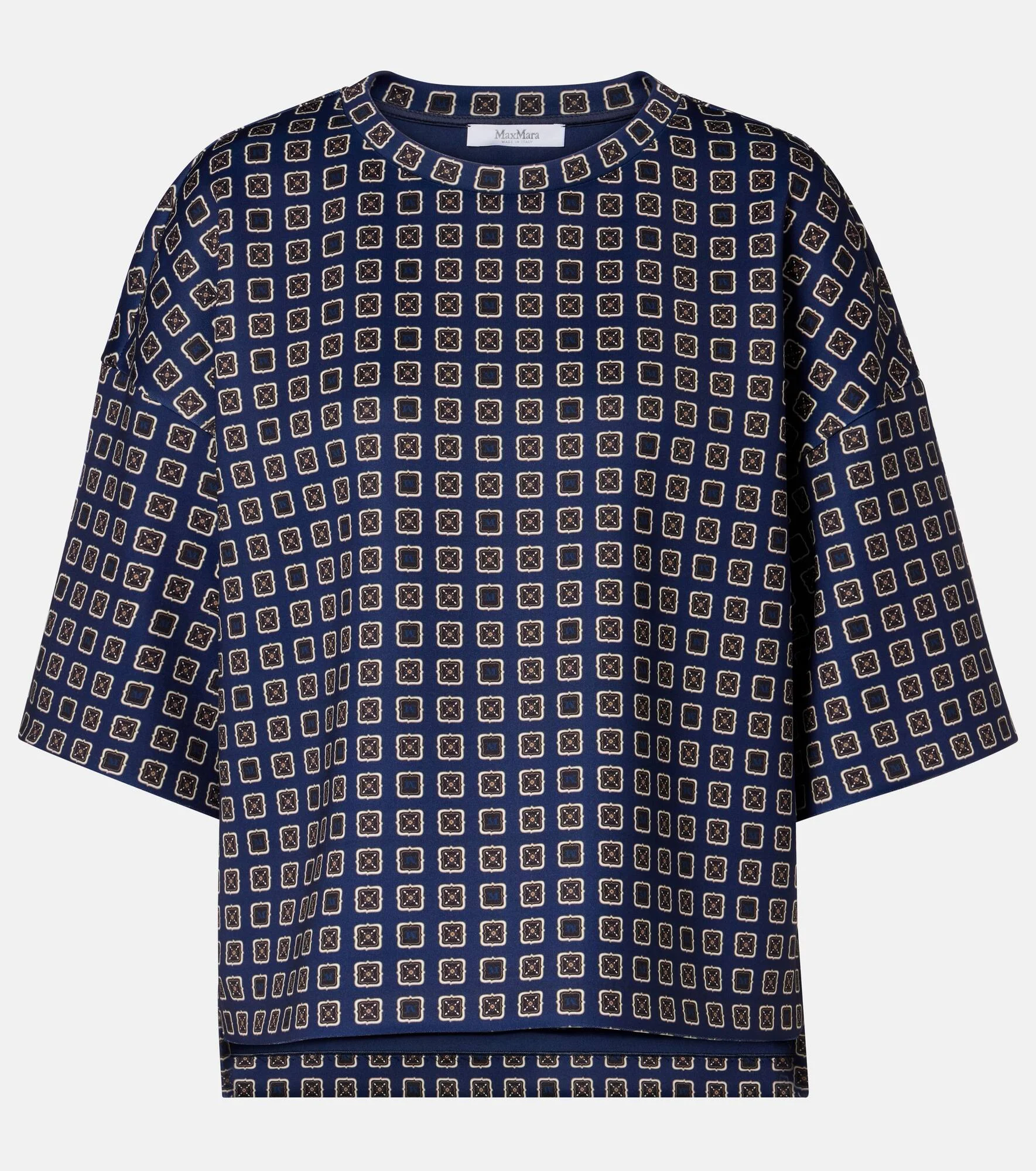 The Notizia top by Max Mara is adorned with an allover archive print from E. Marinella. Crafted from fluid jersey, the design is cut into a boxy silhouette with a round neck and short sleeves. Product Details - Material: 95% polyester, 5% elastane - Care instructions: machine wash at 30 degrees - Made in Italy - Color: blue - Designer color name: Fondo Blu - Item color: blue - Collar: crewneck - Side slits - Item number: P01120775 Size & Fit - True to size - Dropped shoulders - Designed for a loose fit - Non-stretchy fabric - Falls to the hip - The model seen in the picture is 178cm-5'10" and wearing a size XS
