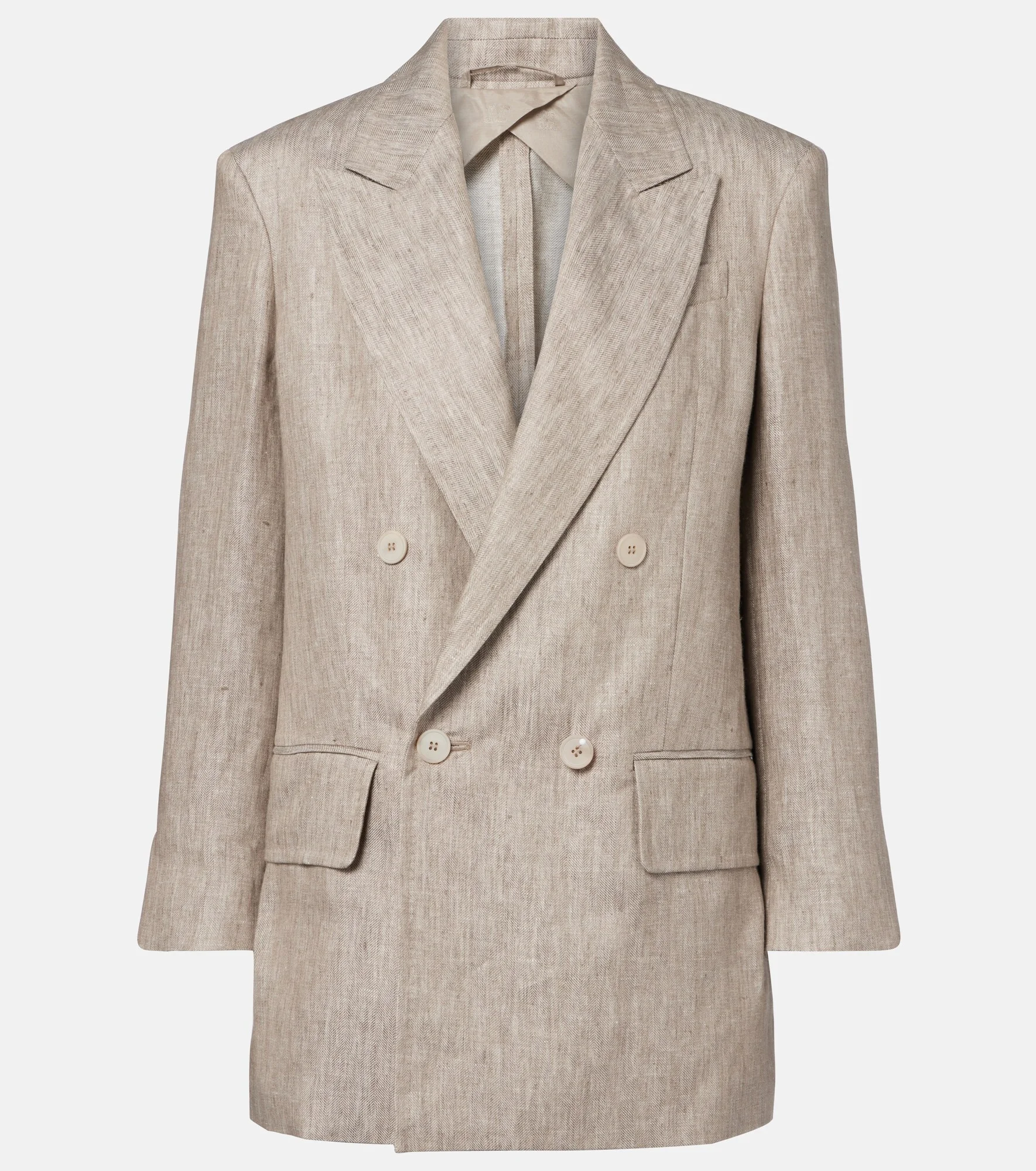 Boasting a rich manufacturing history, Max Mara represents the quintessence of Italian sophistication and expertise. Crafted from linen in an herringbone pattern, this Olimpia double-breasted blazer is designed with a tailored, straight silhouette with peak lapels and flap pockets. Product Details - Material: 100% linen - Care instructions: dry clean - Made in Italy - Color: beige - Designer color name: Greggio - Lining: 57% cupro, 43% cotton - Closure: double-breasted (four buttons) - Peak lapel - Shoulder pads - Cuff: four buttons - Pockets: flap pockets, angled chest pocket - Vent: double - Half-lined - Item number: P01149850 Size & Fit - True to size - Shoulder pad inserts - Straight fit - Non-stretchy fabric - Falls below the hip - The model seen in the picture is 178cm-5'10" and wearing a size DE 34