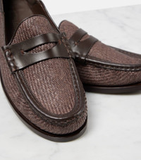 These penny loafers from Max Mara offer a modern perspective on a classic shoe style. Made from a textured raffia-effect fabric, they're trimmed with supple calfskin and feature folding leather heels for versatile wear. Product Details - Upper: fabric - Lining: leather - Sole: leather insole, leather and rubber sole - Toe shape: round toe - Handmade in Italy - Includes: shoe box, dust bag - Designer color name: Noce - Trim: leather - Item number: P00988436 Size & Fit - True to size - For narrow feet, we recommend trying a half size smaller - European sizes - 2cm-1" heel (size EU 38)