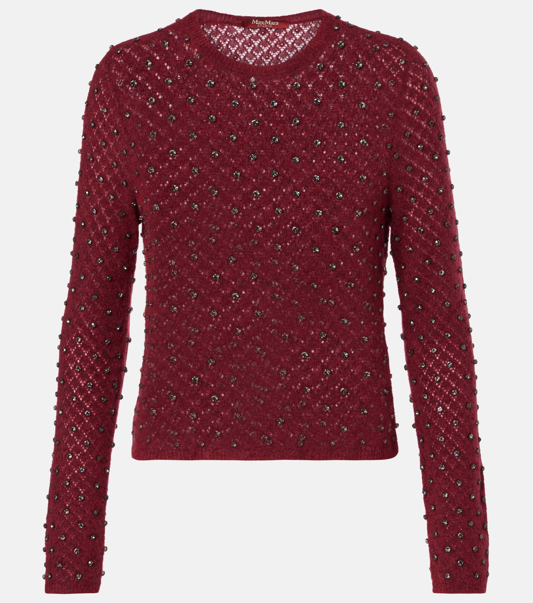 Boasting a rich manufacturing history, Max Mara represents the quintessence of Italian sophistication and expertise. The Rally sweater is made from a mohair and wool blend with a crewneck and sparkling accents. Product Details - Material: 33% polyamide, 32% mohair, 32% wool, 3% elastane - Care instructions: hand wash - Made in China - Designer color name: Amarena - Item color: burgundy - Collar: crewneck - Item number: P01093471 Size & Fit - True to size - Straight fit - Stretchy fabric - Slightly cropped - The model seen in the picture is 178cm-5'10" and wearing a size XS