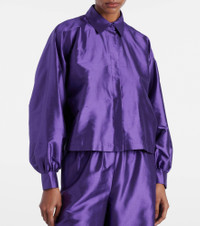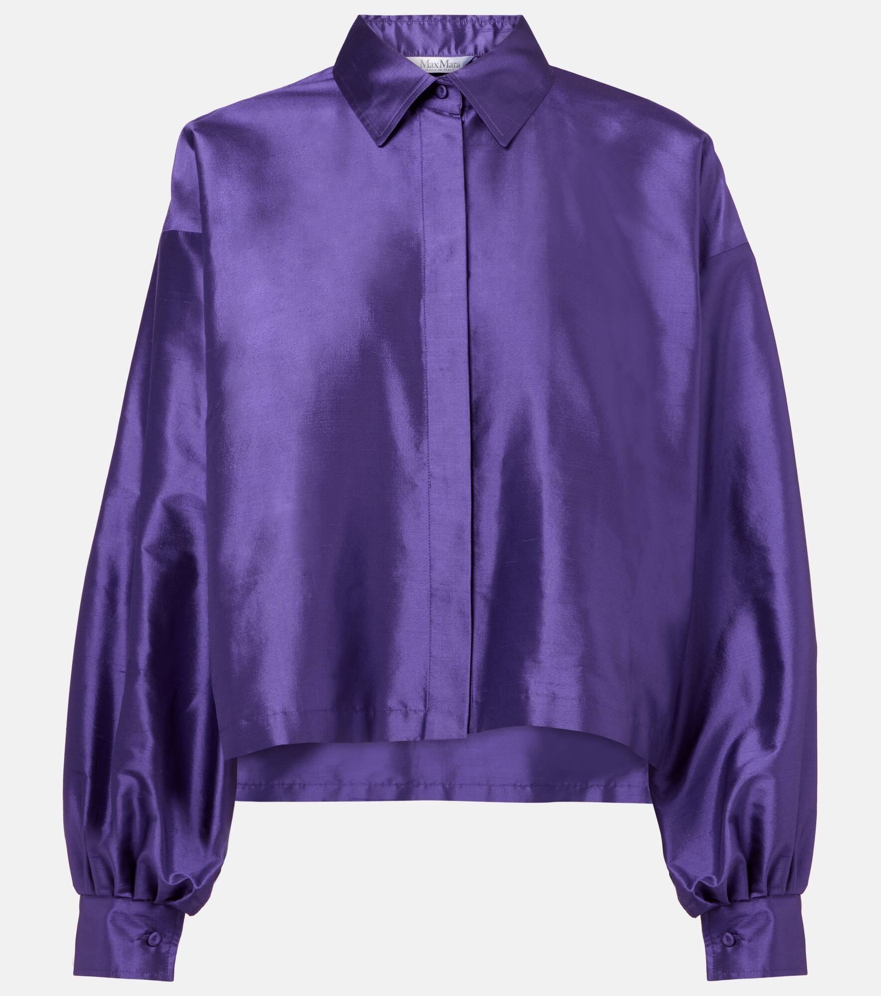 The Scalata shirt from Max Mara is made from pure silk to a boxy silhouette. The statement design features a rich hue and puffed long sleeves. Product Details - Material: 100% silk - Care instructions: dry clean - Made in Italy - Designer color name: Iris - Item color: purple - Closure: buttoned front - Buttoned cuffs - Item number: P01023982 Size & Fit - True to size - Dropped shoulders - Designed for a loose fit - Non-stretchy fabric - Slightly cropped - The model seen in the picture is 178cm-5'10" and wearing a size DE 34
