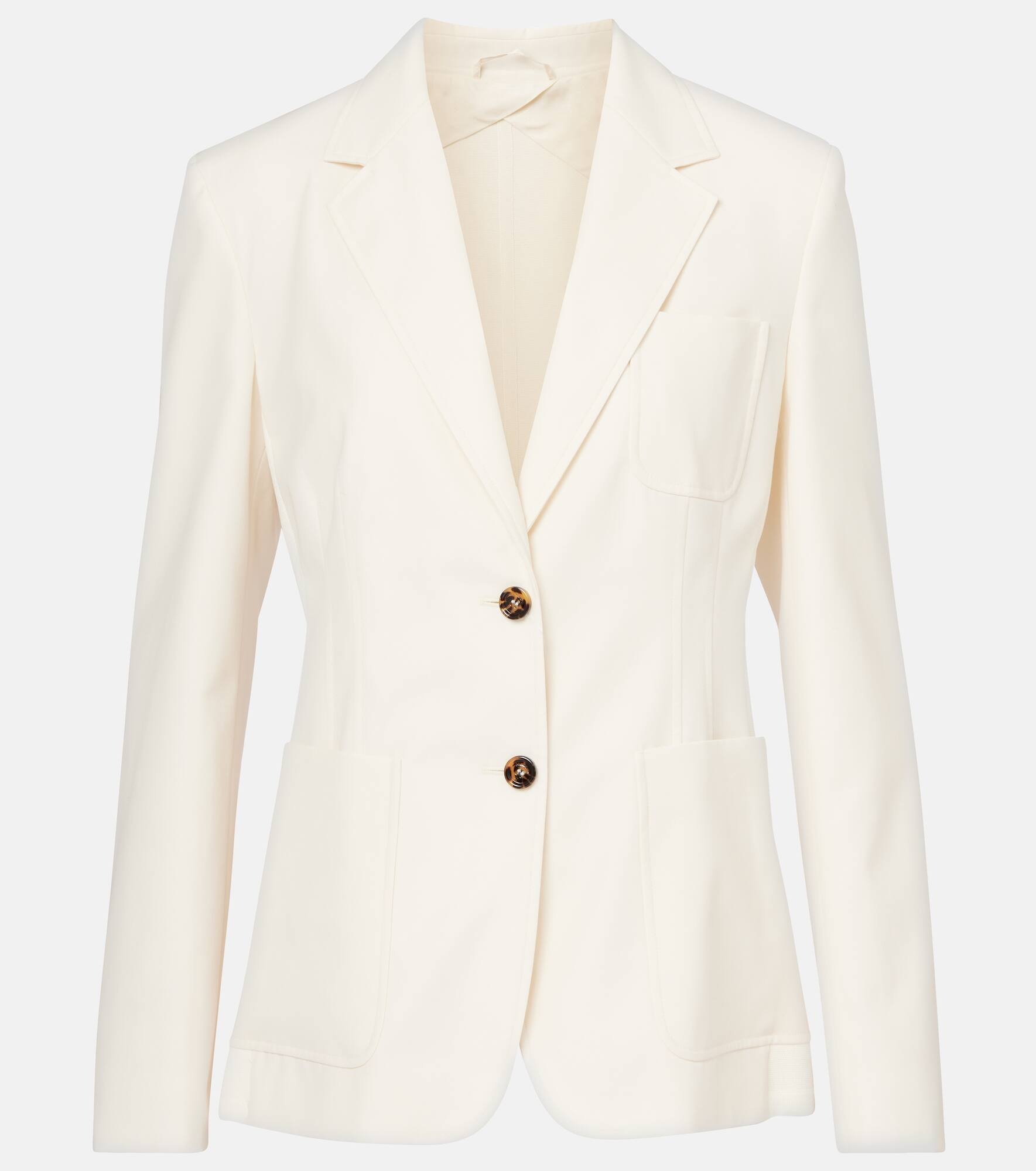 Boasting a rich manufacturing history, Max Mara represents the quintessence of Italian sophistication and expertise. This blazer is cut from pure cotton to a classic single-breasted silhouette with notched lapels and horn buttons. Product Details - Material: 100% cotton - Care instructions: dry clean - Made in Italy - Designer color name: Avorio - Item color: ivory - Lining: 54% viscose, 46% cotton - Material II: 96% viscose, 4% polyester - Closure: single-breasted - Pockets: patch pockets - Buttoned cuffs - Item number: P01023941 Size & Fit - True to size - Shoulder pad inserts - Cinched waist - Non-stretchy fabric - Falls to the hip - The model seen in the picture is 178cm-5'10" and wearing a size DE 34