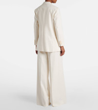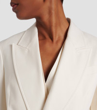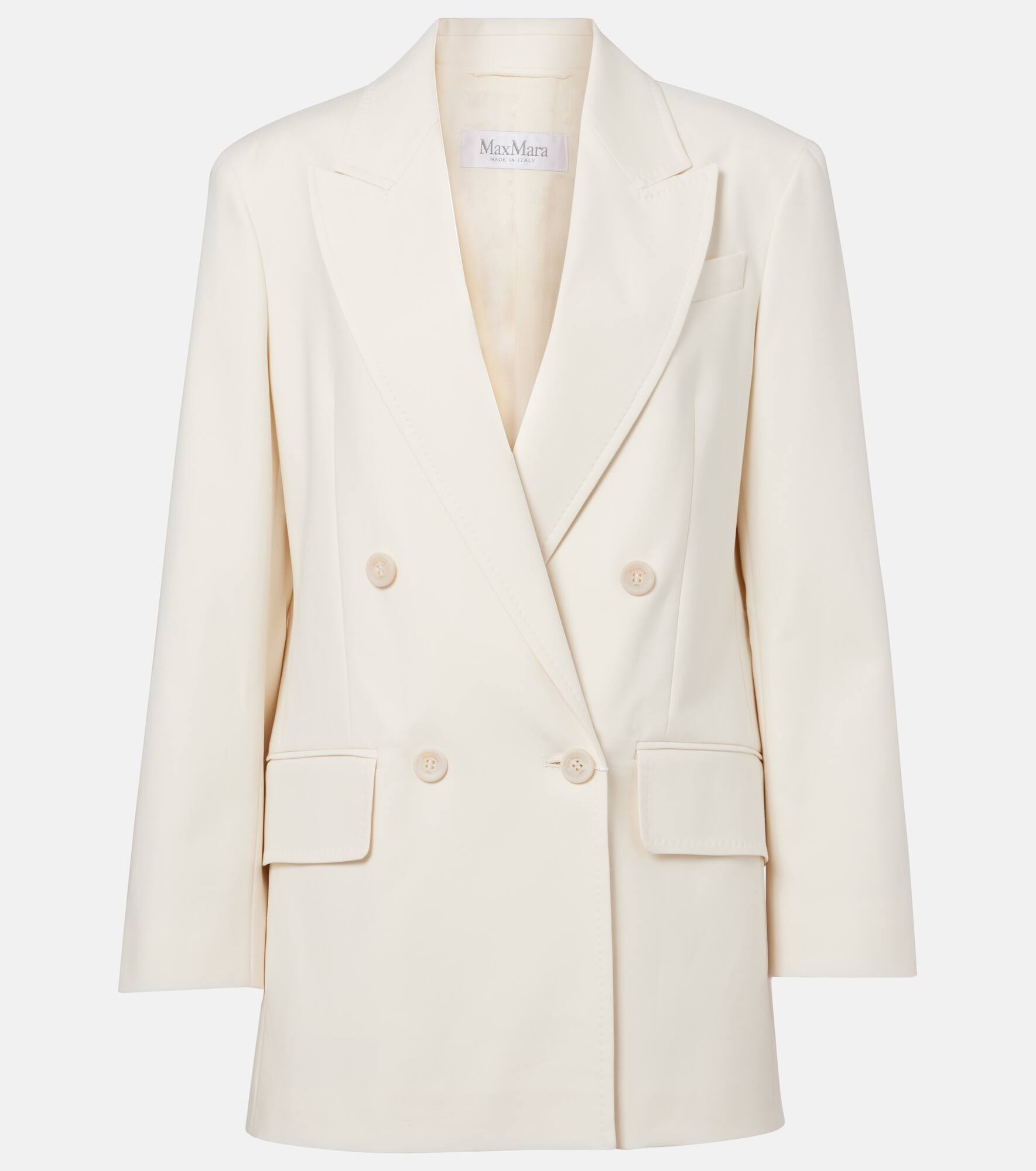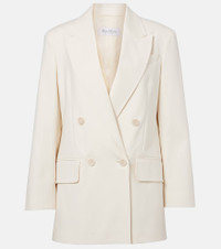 The Suez double-breasted blazer from Max Mara is made from a mostly cotton blend. The piece is fully lined and features an inner lining with all-over signature letter motifs. Product Details - Material: 95% cotton, 5% elastane - Care instructions: dry clean - Made in Italy - Designer color name: Bianco - Item color: white - Lining: 65% acetate, 35% polyester - Contains non-textile parts of animal origin - Closure: double-breasted buttoned front - Notched lapel - Cuff: four buttons - Pockets: flap pockets, welt pocket - Shoulder pads - Vent: double - Fully lined - Item number: P01079097 Size & Fit - True to size - Shoulder pad inserts - Straight fit - Non-stretchy fabric - Falls below the hip - The model seen in the picture is 178cm-5'10" and wearing a size DE 34