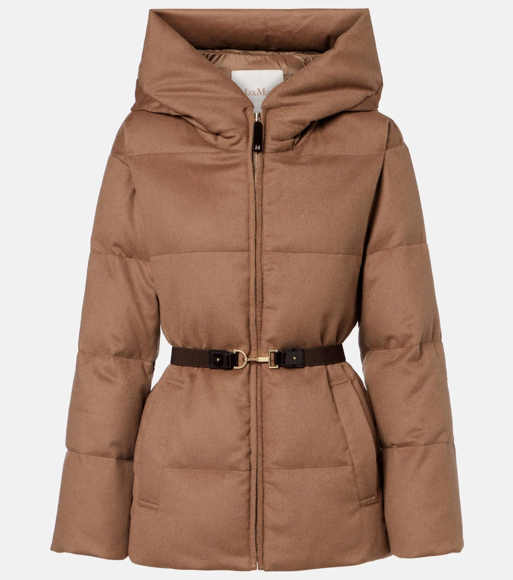 Since its inception in 2008, the Cube line from Max Mara has amassed a cult following of its innovative outerwear. Expertly crafted from camel hair, the Corona puffer jacket features insulating padding, a detachable cinching belt, and protective hood. Product Details - Material: 100% camel hair - Care instructions: dry clean - Made in Romania - Color: beige - Designer color name: Cammello - Lining: 100% polyester - Closure: zipped front - Hood - Cuff: elasticated - Pockets: welt pockets - Drawstring at the hem for adjustable fit - Item number: P01124664 Size & Fit - True to size - For a looser fit, we recommend taking one size up - Loose fit, elasticated waist - Adjustable at the waist - Non-stretchy fabric - Falls below the hip - The model seen in the picture is 178cm-5'10" and wearing a size DE 34