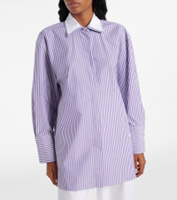 Max Mara's Tubinga shirt blurs the line between smart and casual. Designed for a modern, oversized fit, this button-down style is made from crisp cotton-blend poplin with a striped print and a contrasting collar. Product Details - Material: 97% cotton, 3% elastane - Care instructions: machine wash at 30 degrees - Made in Italy - Designer color name: Bianco/Iris - Closure: button-down - Item number: P01023976 Size & Fit - True to size - Dropped shoulders - Designed for a loose fit - Non-stretchy fabric - Falls below the hip - The model seen in the picture is 178cm-5'10" and wearing a size DT 34