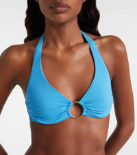 Melissa Odabash's Brussels halterneck bikini top is an enviable addition to your vacation edit. Designed with SPF 50+ protection, the blue style features a gold-tone ring at the center-bust and offers comfortable coverage. Product Details - Material: 86% polyamide, 14% elastane - Care instructions: hand wash - Made in Italy - Designer color name: Ocean - Item color: blue - Hardware color: gold - Underwired cups - Self-tie neck and back - Item number: P01125425 Size & Fit - True to size - Underwired top - Unpadded Top - The model seen in the picture is 178cm-5'10", cup size B, and wearing a size IT 40