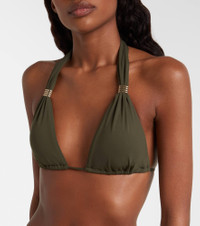 Complete your destination wardrobe with the Grenada bikini top from Melissa Odabash. Designed with SPF 50+ protection, the halterneck style has gold-toned hardware and can be adjusted for a customized fit. Match it with the label's coordinating bikini bottoms. Product Details - Material: 86% polyamide, 14% elastane - Care instructions: hand wash - Made in Italy - Designer color name: Olive - Item color: green - Hardware color: gold - Padded cups - Self-tie neck and back - Item number: P01125430 Size & Fit - True to size - Removable padding - The model seen in the picture is 178cm-5'10", cup size B, and wearing a size IT 40