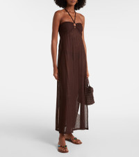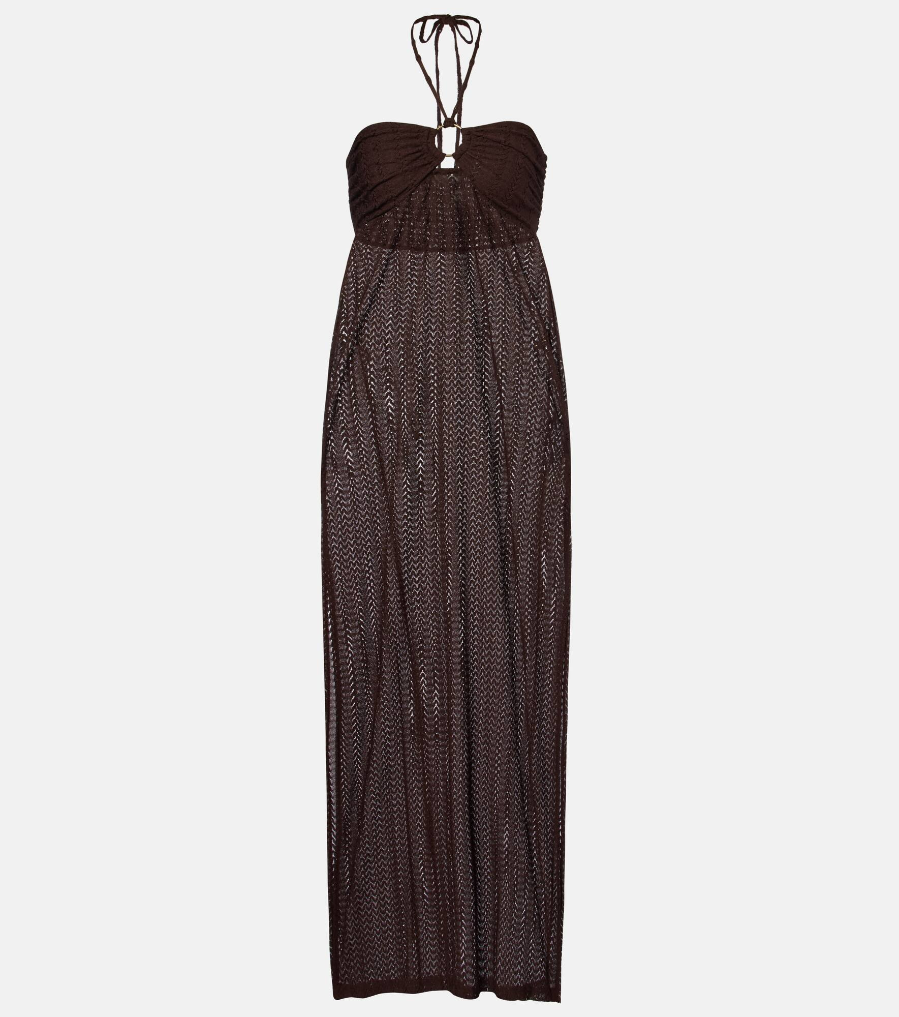 After working as a swimwear model, Melissa Odabash used her experience to create designs that are equal parts stylish and comfortable. The Harriet maxi dress features a halterneck, side slits, and a front keyhole cutout with a gold-toned ring. Product Details - Material: 98% polyester, 2% elastane - Care instructions: hand wash cold - Made in China - Designer color name: Brown Ribbed - Item color: brown - Hardware color: gold - Self-tie neck - Side slits - Item number: P01125416 Size & Fit - True to size - Semi-sheer - Elasticated top - Designed for a loose fit - Slightly stretchy fabric - The model seen in the picture is 178cm-5'10" and wearing a size XS