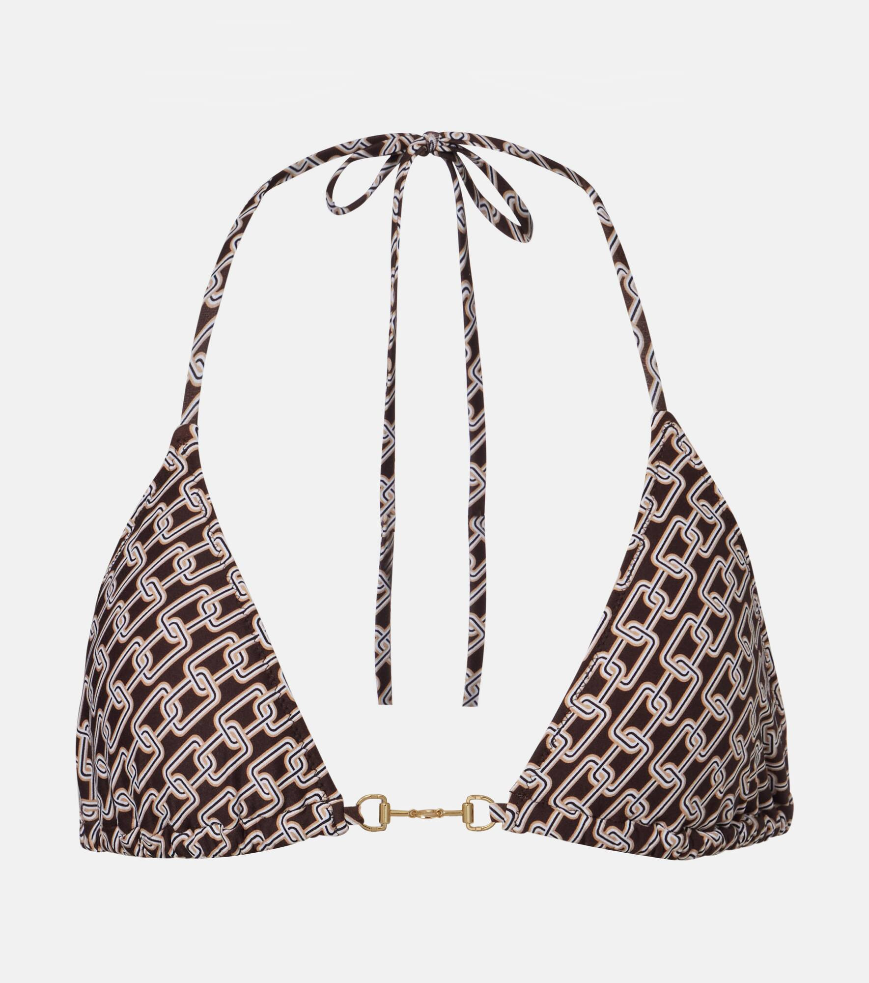 After working as a swimwear model, Melissa Odabash used her experience to create pieces that are equal parts stylish and comfortable. Designed with SPF 50+ protection, the Menorca bikini top showcases printed chains and features a horsebit detail at the center. Product Details - Material: 86% polyamide, 14% elastane - Care instructions: hand wash - Made in Italy - Designer color name: Chain - Item color: brown, white - Hardware color: gold - Self-tie neck and back - Removable cup padding - Includes: dust bag - Item number: P01125407 Size & Fit - True to size - Removable padding - The model seen in the picture is 178cm-5'10", cup size B, and wearing a size IT 40