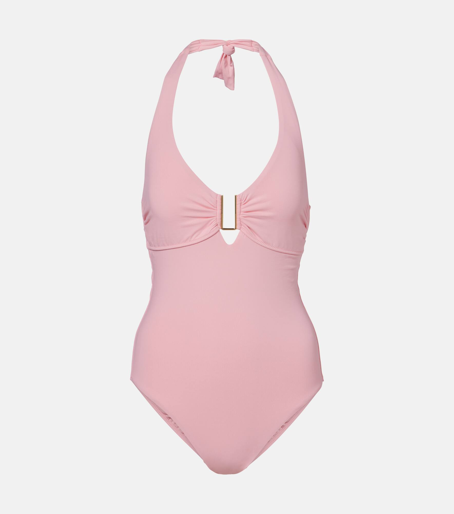 Melissa Odabash's Tampa swimsuit has been crafted in Italy from stretch fabric, shaped for a flattering and supportive fit. The design is topped with a halterneck tie, while its plunging neckline is finished with golden metal bar hardware. Product Details - Material: 86% polyamide, 14% elastane - Care instructions: hand wash - Made in Italy - Designer color name: Rose - Item color: pink - Hardware color: gold - Padded cups - Self-tie neck - Item number: P01125384 Size & Fit - True to size - Removable padding - Medium-cut leg - The model seen in the picture is 178cm-5'10", cup size B, and wearing a size IT 40