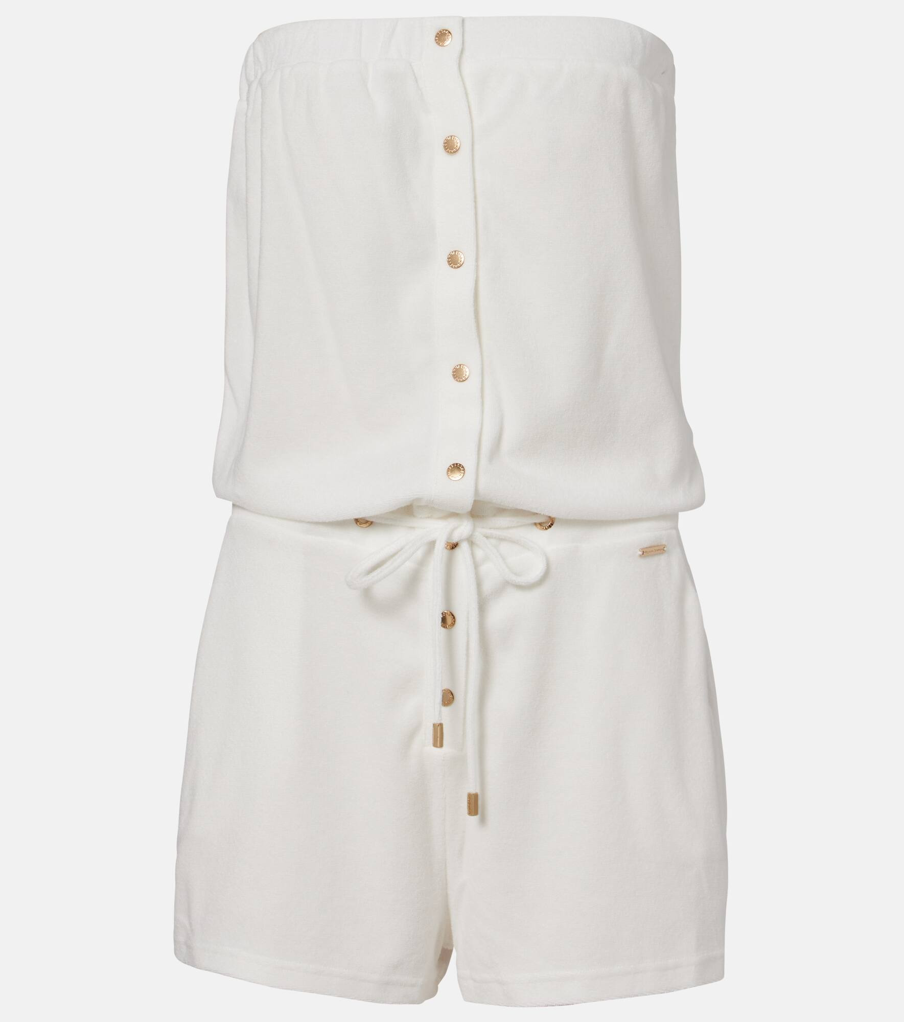 Melissa Odabash used her experience as a swimwear model to create designs that are equal parts stylish and comfortable. Crafted from a cotton blend, the Venus romper features an adjustable drawstring waist and a strapless bodice with an elasticated band. Product Details - Material: 80% cotton, 20% polyester - Care instructions: hand wash cold - Made in China - Designer color name: White - Item color: white - Hardware color: gold - Closure: snap-buttoned front - Elasticated drawstring waist - Pockets: slant pockets - Item number: P01125440 Size & Fit - True to size - Strapless - Loose fit, drawstring waist - Slightly stretchy fabric - Wide-leg - The model seen in the picture is 178cm-5'10" and wearing a size XS