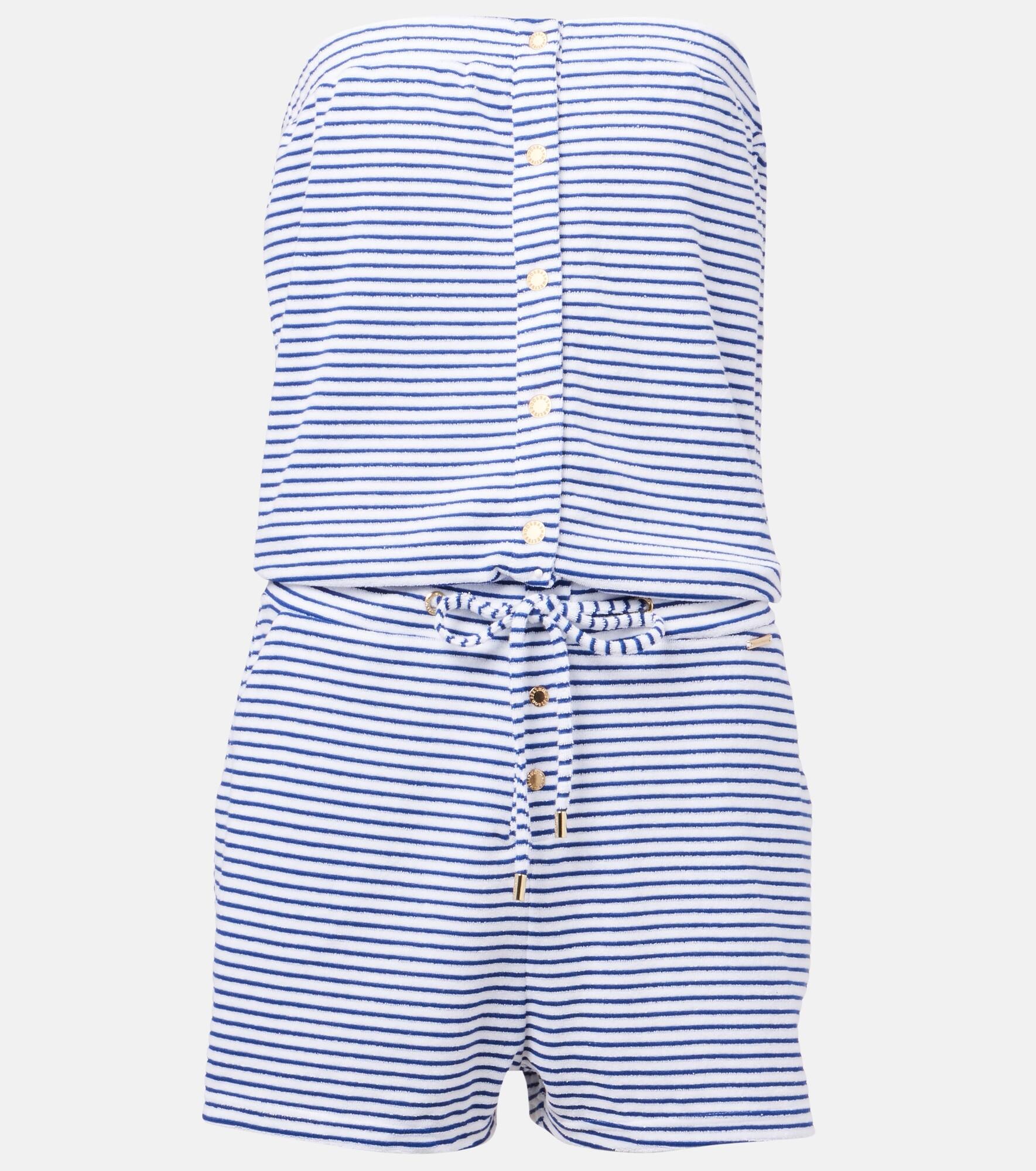 After working as a swimwear model, Melissa Odabash used her experience to create designs that are equal parts stylish and comfortable. Crafted from a cotton blend terry, the Venus romper features a bandeau silhouette, a striped pattern, and branded cord-ends. Product Details - Material: 80% cotton, 20% polyester - Care instructions: hand wash - Made in China - Designer color name: Stripe - Item color: blue - Closure: buttoned front - Pockets: side slit pockets - Drawstring waist - Item number: P01041644 Size & Fit - True to size - Strapless - Loose fit, drawstring waist - Non-stretchy fabric - Straight leg - The model seen in the picture is 178cm-5'10" and wearing a size XS