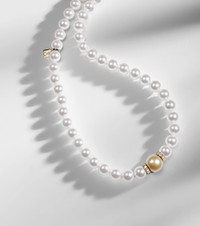 Balancing traditional Japanese metalwork and European manufacturing techniques, Mikimoto's sophisticated treasures are designed to spotlight your inner radiance. Featuring a row of exquisite Akoya pearls, this 18kt yellow gold necklace is defined by a captivating golden South Sea pearl surrounded by dazzling diamond rondelles. The style is complete with a decorated ribbon clasp and an M charm for a signature finish. Product Details - Material: 18kt yellow gold (750/1000) - Made in the USA - Item color: white, gold - Color: white - Pearl I: Akoya cultivated - Pearl II: South Sea cultivated - Stone I: 18 diamonds, 0.3ctw, round-cut, pave setting - Closure: clasp fastening - This piece features natural diamonds only - Item number: P01103427 Size & Fit - Length when open 46,5cm-18.5" - Min. width 3mm-0.1" - Max. width 9mm-0.35" - Pendant length 12mm-0.45" - Pendant width 4mm-0.15"