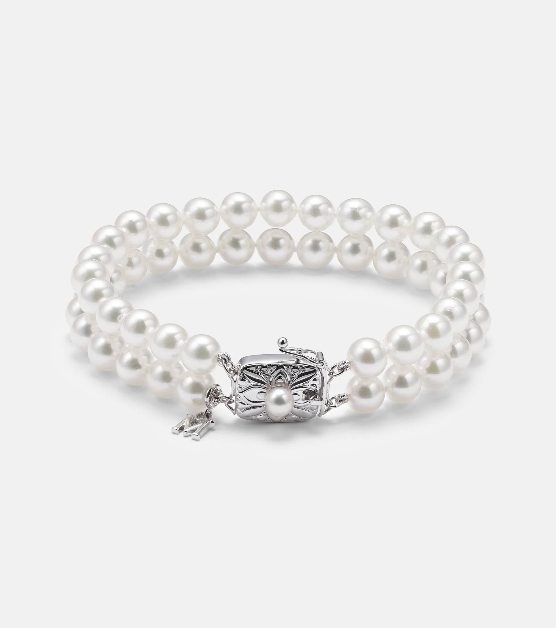 Balancing traditional Japanese metalwork and European manufacturing techniques, Mikimoto's sophisticated treasures are designed to spotlight your inner radiance. Featuring two rows of exquisite Akoya pearls, this 18kt white gold bracelet is enriched with a decorated ribbon clasp and an M charm for a signature finish. Product Details - Material: 18kt white gold (750/1000) - Made in the USA - Item color: white gold, white - Color: silver - Pearl I: Akoya cultivated - Closure: clasp fastening - Item number: P01103398 Size & Fit - Length when open 20cm-8" - Max. width 12mm-0.45"