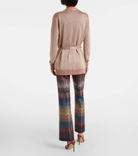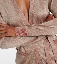 This cardigan from Missoni brings shimmering sophistication to your ensembles. The style is made from lame to a chic wrap silhouette and comes with a matching self-tie belt. Product Details - Material: 77% viscose, 20% metallic fibres, 2% polyamide, 1% elastane - Care instructions: dry clean - Made in Romania - Designer color name: Rose gold tones - Item color: pink - Pockets: patch pockets - Closure: belted waist - Sleeves: long-sleeved - Regular fit - Length: long (thigh-length) - Hem: ribbed, straight - Cuff: ribbed - Item number: P01045557 Size & Fit - True to size - Dropped shoulders - Loose fit, comes with belt - Slightly stretchy fabric - Falls below the hip - Height of model is 175cm-69" and wears a size IT 40