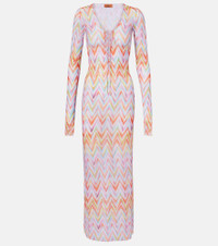 Crafted from tulle, this beach dress from Missoni is cut to a maxi length with a flattering, fitted silhouette. The design is finished with a self-tie neckline and the brand's signature all-over Chevron print. Product Details - Material: 93% polyamide, 7% elastane - Care instructions: dry clean - Made in Italy - Designer color name: Multicolor Micro Chevron - Item color: multicolor - Closure: self-ties - Collar: V-neck - Item number: P01035092 Size & Fit - True to size - Sheer - Fitted - Stretchy fabric - The model seen in the picture is 178cm-5'10" and wearing a size IT 38