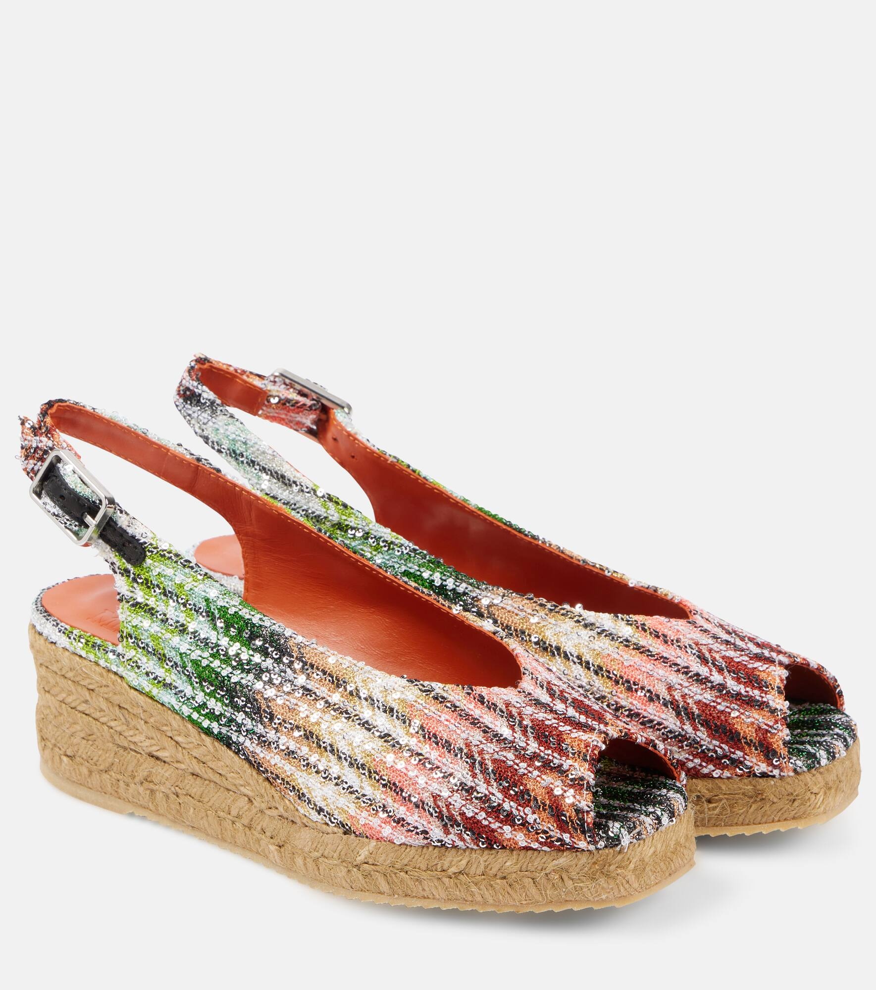 Product Details - Upper: fabric - Lining: leather - Sole: leather insole, rubber sole - Toe shape: square open toe - Made in Spain - Includes: shoe box, dust bag - Designer color name: Multicolored - Closure: buckle fastening - Hardware color: silver - Item number: P01016681 Size & Fit - True to size - Slightly wide - European sizes - 2cm-1" platform (size EU 38) - 5cm-2" wedge heel (size EU 38)