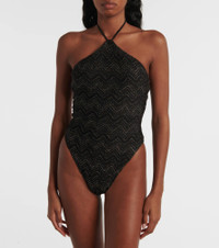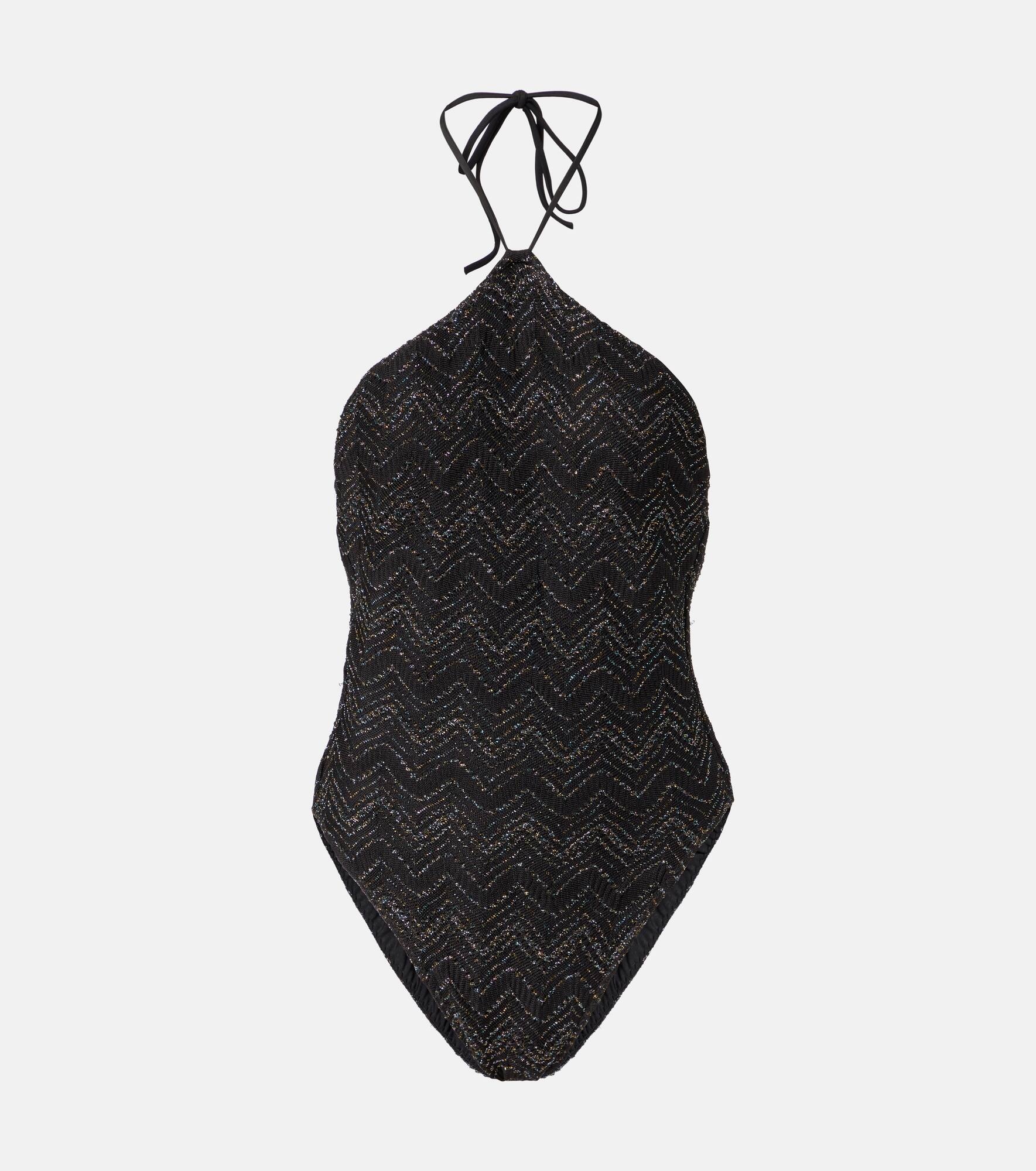 Zig zag lamé viscose one-piece swimsuit with halter neck