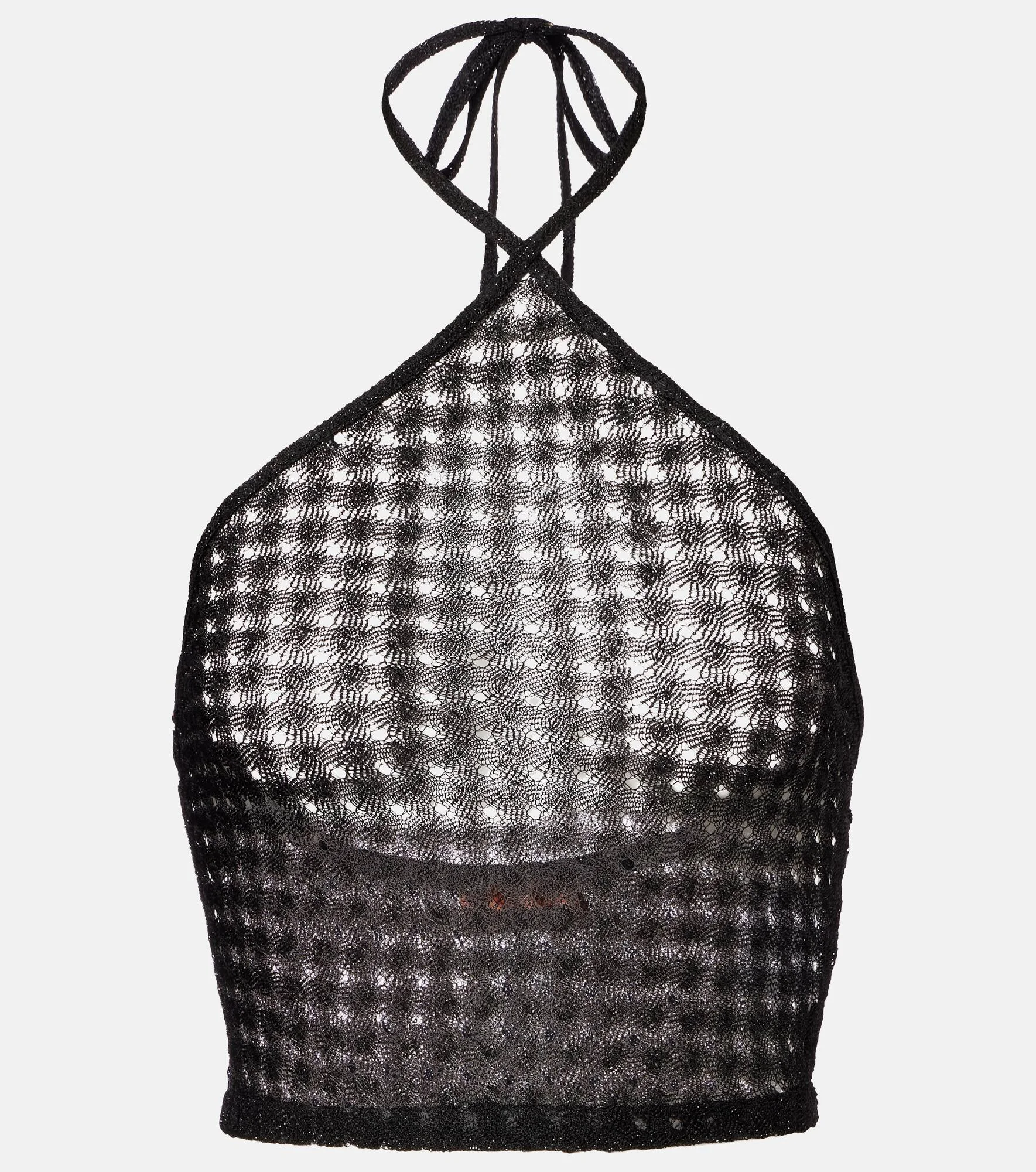 Missoni is the go-to choice for effortless beach looks and poolside glamour. This lame crop top is designed with a self-tie halterneck and an open-knit finish. Product Details - Material: 83% viscose, 17% metallic fibres - Care instructions: dry clean - Made in Italy - Designer color name: Black - Item color: black - Self-tie neck - Item number: P01107526 Size & Fit - True to size - Low back - Fitted - Stretchy fabric - Cropped - Height of model is 174cm-68.5" and wears a size IT 38