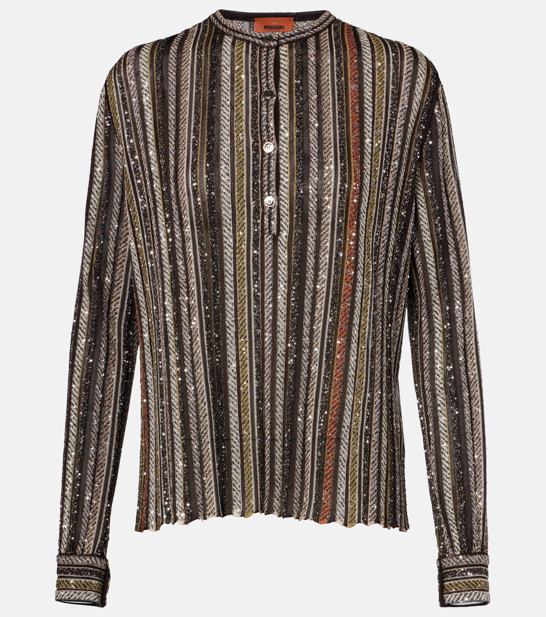 This Henley shirt from Missoni is made to a characteristic colorful design with interwoven metallic fibers. It features a striped pattern and a raw-trimmed hem. Product Details - Material: 63% viscose, 32% polyamide, 5% metallic fibres - Care instructions: dry clean - Made in Italy - Designer color name: Beige And Brown Tones - Item color: multicolor - Closure: buttoned placket - Collar: band - Item number: P01045569 Size & Fit - True to size - Designed for a loose fit - Stretchy fabric - Falls below the hip - The model seen in the picture is 178cm-5'10" and wearing a size IT 38