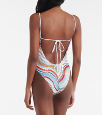 Missoni’s signature wave motif delivers vibrancy with this swimsuit. Enhanced with a touch of shimmer, its textured raschel knit and sleek fit make it a striking addition to your swimwear collection. Product Details - Material: 95% viscose, 5% metallic fibres - Care instructions: hand wash - Made in Italy - Designer color name: Multicolor w/White Base - Lining: 80% polyamide, 20% elastane - Self-tie back - Item number: P01002423 Size & Fit - True to size - Unpadded Top - Medium-cut leg - The model seen in the picture is 178cm-5'10", cup size B, and wearing a size IT 40