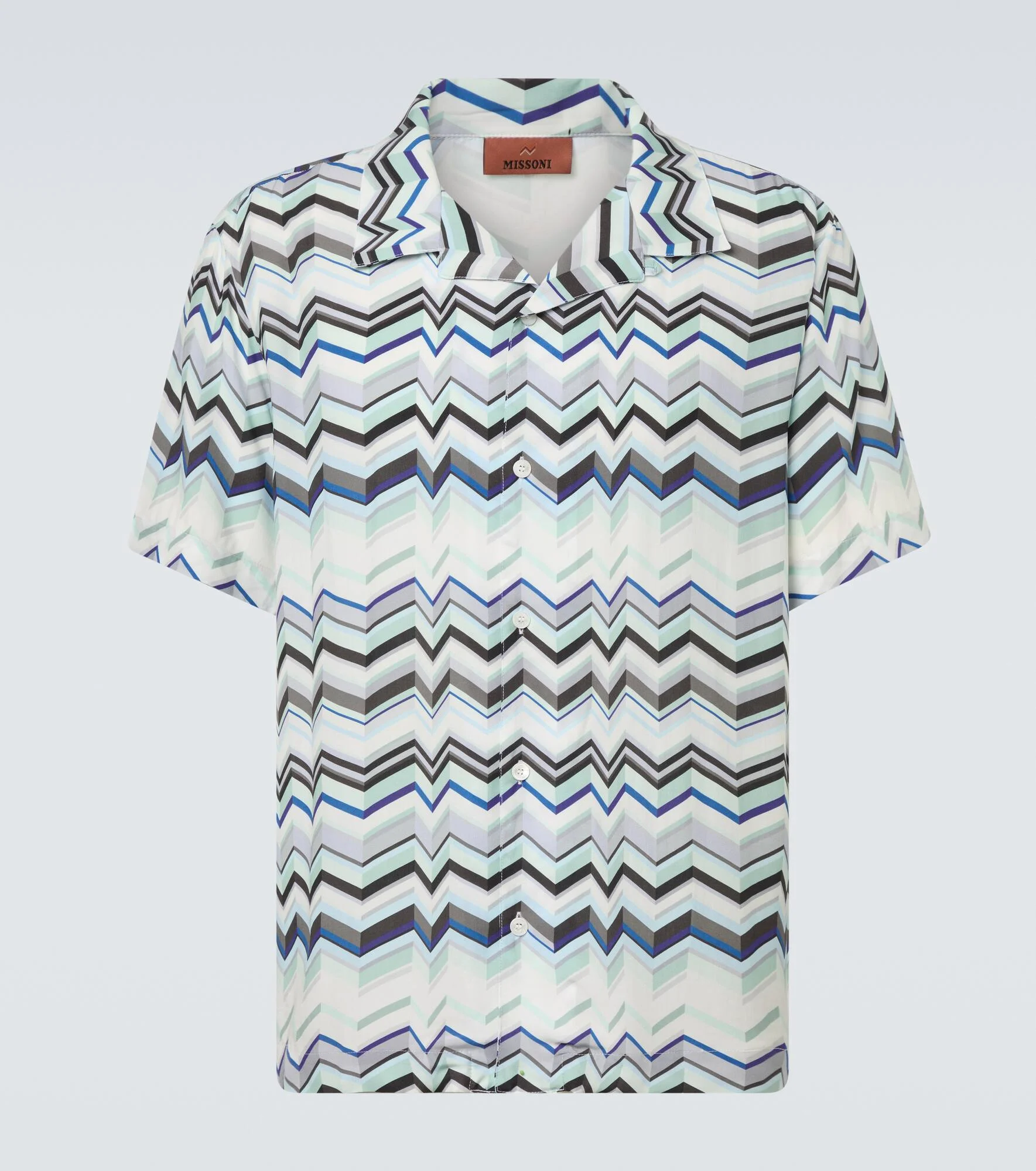 Missoni's iconic Zigzag pattern was first introduced in the 1950s and is now a symbol of Italian luxury. This bowling shirt features a fluid, short-sleeved design and the allover signature print in a blue colorway. Product Details - Material: 100% viscose - Care instructions: machine wash at 30 degrees - Made in Tunisia - Color: blue - Designer color name: Light Blue Tones - Contains non-textile parts of animal origin - Item number: P01135029 Size & Fit - True to size - Without pleats in the back - Designed for a loose fit - Non-stretchy fabric - Falls below the hip - Height of model is 189cm-74.5" and wears a size L