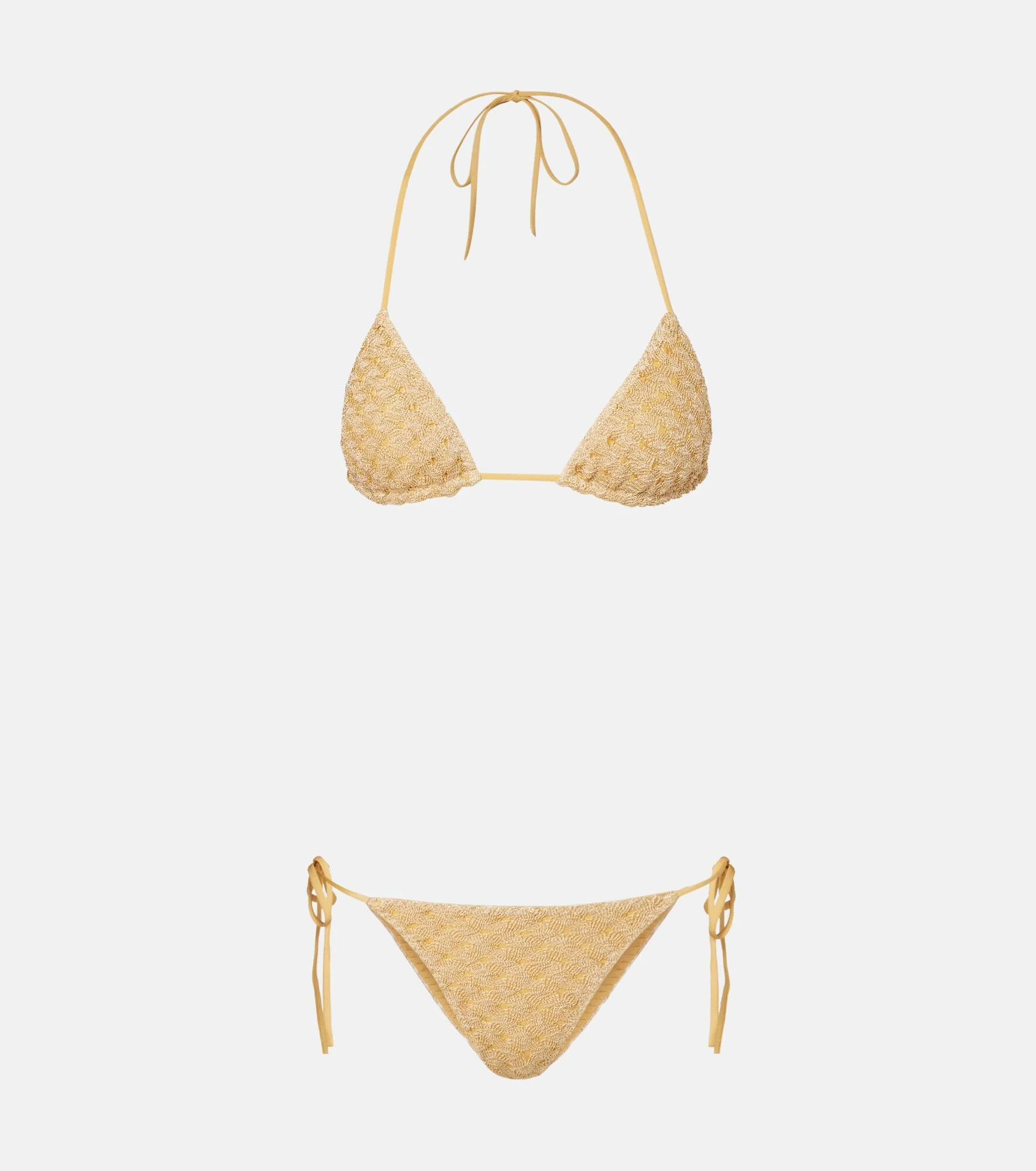 This lame bikini features Missoni's iconic Zig Zag pattern, which was first introduced in the 1950s and is now a symbol of Italian luxury. The vibrant design is complete with self-ties for a customizable fit. Product Details - Material: 83% viscose, 17% metallic fibres - Care instructions: hand wash - Made in Italy - Designer color name: Gold - Item color: gold - Lining: 90% polyamide, 10% elastane - Closure: self-ties - Includes: dust bag - Item number: P01107523 Size & Fit - True to size - Unpadded Top - Minimal coverage - Low-cut leg - The model seen in the picture is 178cm-5'10", cup size B, and wearing a size IT 38