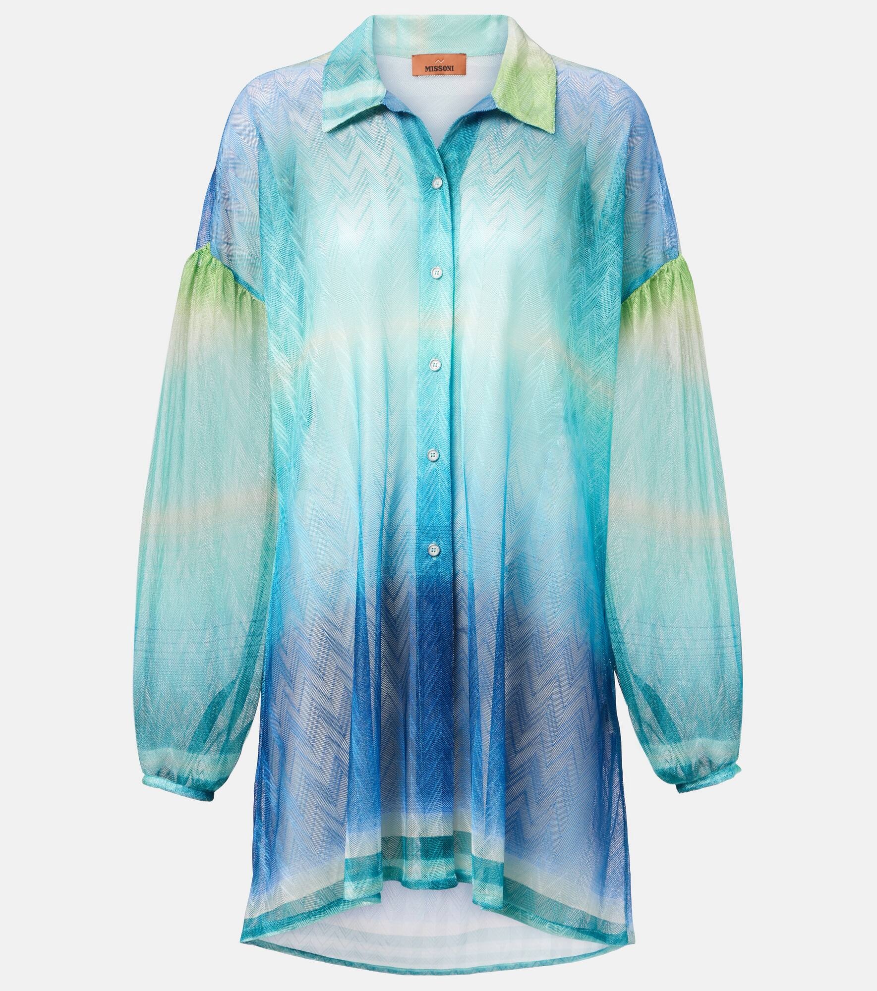 Missoni's iconic Zig Zag pattern was first introduced in the 1950s and is now a symbol of Italian luxury. The motif appears all over this oversized, semi-sheer shirt. Product Details - Material: 100% polyester - Care instructions: dry clean - Made in Italy - Designer color name: Blue and green gradient - Item color: multicolor - Collar: classic (Straight point) - Closure: buttoned front - Sleeves: long-sleeved, dropped shoulder - Item number: P01045530 Size & Fit - True to size - Dropped shoulders - Sheer - Oversized - Stretchy fabric - Falls below the hip - The model seen in the picture is 178cm-5'10" and wearing a size XS