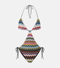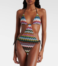 Missoni's iconic Zig Zag pattern was first introduced in the 1950s and is now a symbol of Italian luxury. Finished with the signature motif, this swimsuit features a central panel that creates a cut-out effect, connecting the top and bottom sections. Product Details - Material: 83% viscose, 17% metallic fibres - Care instructions: hand wash - Made in Italy - Designer color name: Multicolor w/Dark Base - Item color: multicolor - Lining: 80% polyamide, 20% elastane - Closure: self-ties - Item number: P01107477 Size & Fit - True to size - Unpadded Top - Minimal coverage - Medium-cut leg - The model seen in the picture is 178cm-5'10", cup size B, and wearing a size IT 38