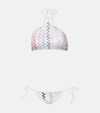 Crafted in Italy, this bikini features a halterneck style, sequin embellishments, and the signature zigzag pattern all over. Missoni's iconic Zig Zag pattern was first introduced in the 1950s and is now a symbol of Italian luxury. Product Details - Material: 64% viscose, 36% polyester - Care instructions: hand wash - Made in Italy - Designer color name: Multicolor - Item color: multicolor - Two-piece set - Lining: 80% polyamide, 20% elastane - Item number: P01035081 Size & Fit - True to size - Adjustable at the waist - Unpadded Top - Minimal coverage - Medium-cut leg - The model seen in the picture is 178cm-5'10", cup size B, and wearing a size IT 38