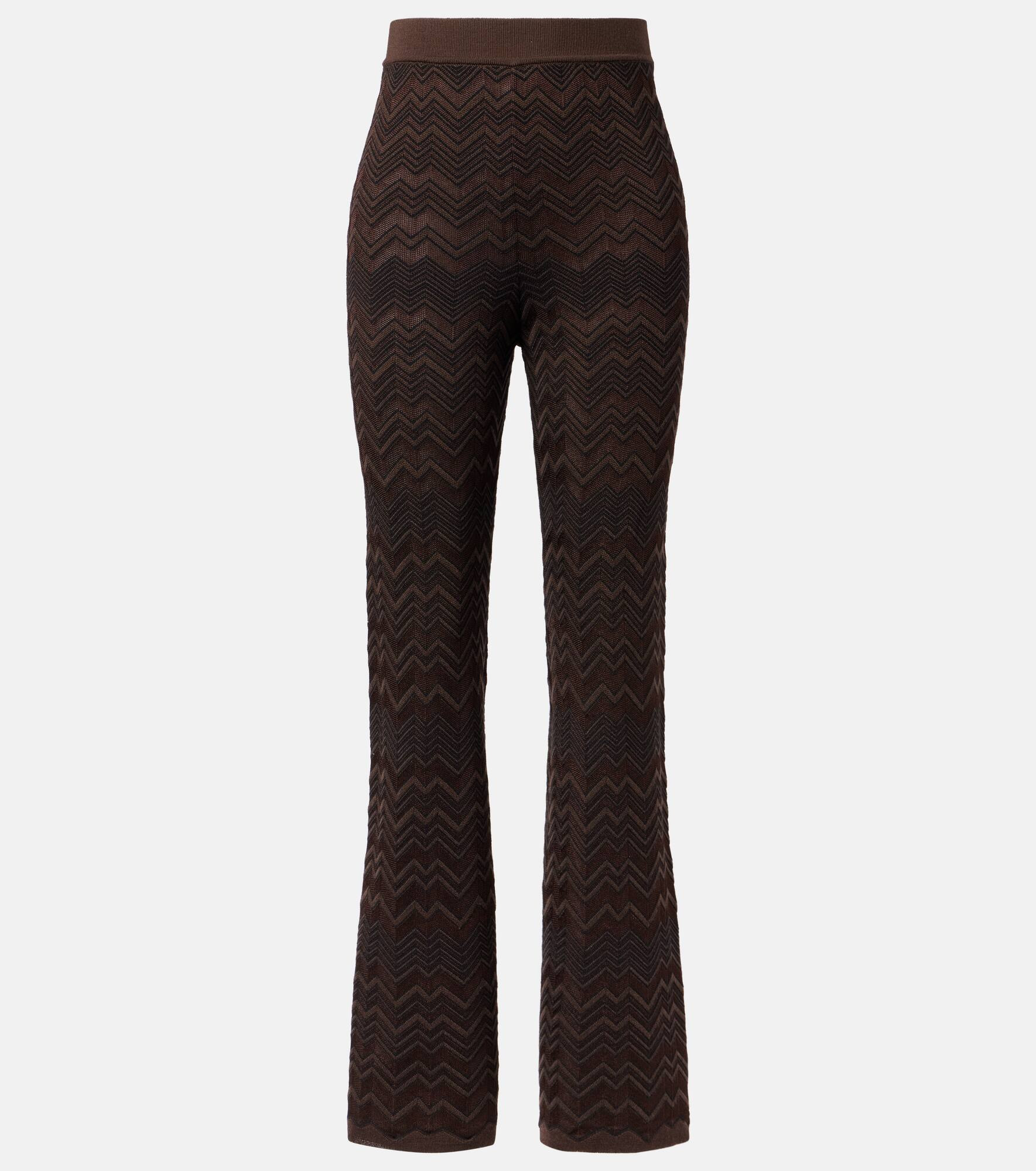 Missoni's iconic Zigzag pattern was first introduced in the 1950s and is now a symbol of Italian luxury. These knitted pants feature the beloved motif and come in a relaxed, slightly flared silhouette. Product Details - Material: 52% viscose, 35% wool, 10% polyester, 2% polyamide, 1% elastane - Care instructions: dry clean - Made in Moldova - Designer color name: Solid color brown - Item color: brown - Fit: flared - High-rise - Elasticated waistband - Full length - Item number: P01045591 Size & Fit - True to size - Stretchy fabric - Slim-leg with a flared hem - High-waisted - The model seen in the picture is 178cm-5'10" and wearing a size IT 38