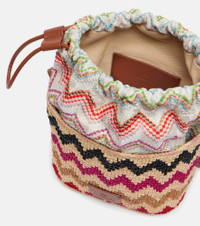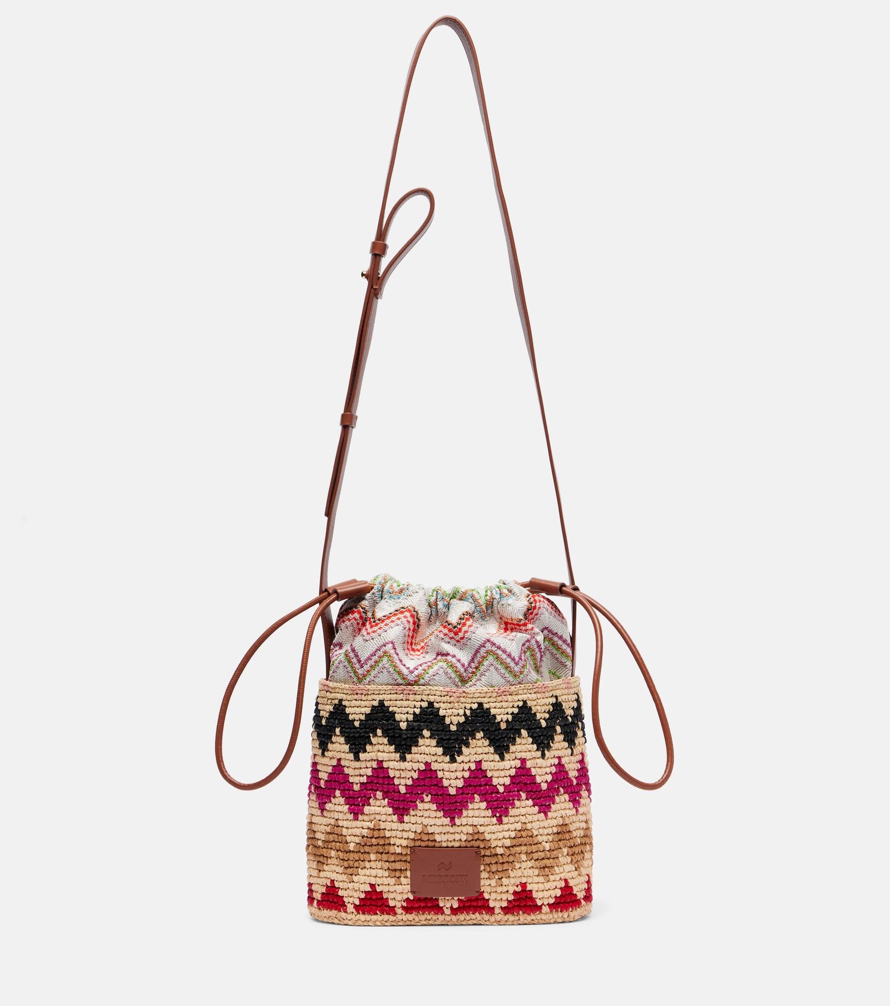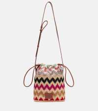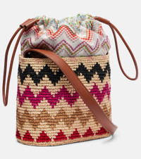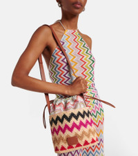 Crafted from raffia, this bucket bag from Missoni features an adjustable shoulder strap and a zigzag pattern all over. Missoni's iconic Zig Zag pattern was first introduced in the 1950s and is now a symbol of Italian luxury. Product Details - Material: fabric, raffia, leather - Lining: fabric - Made in Italy - Designer color name: Multicolor - Item color: multicolor - Adjustable shoulder strap - Closure: drawstring top - Contains non-textile parts of animal origin - Includes: dust bag - Item number: P00992707 Size & Fit - Height 23cm-9" - Width 20.5cm-8" - Depth 11cm-4.5" - Adjustable shoulder strap - Max. length shoulder strap 113cm-44.5"