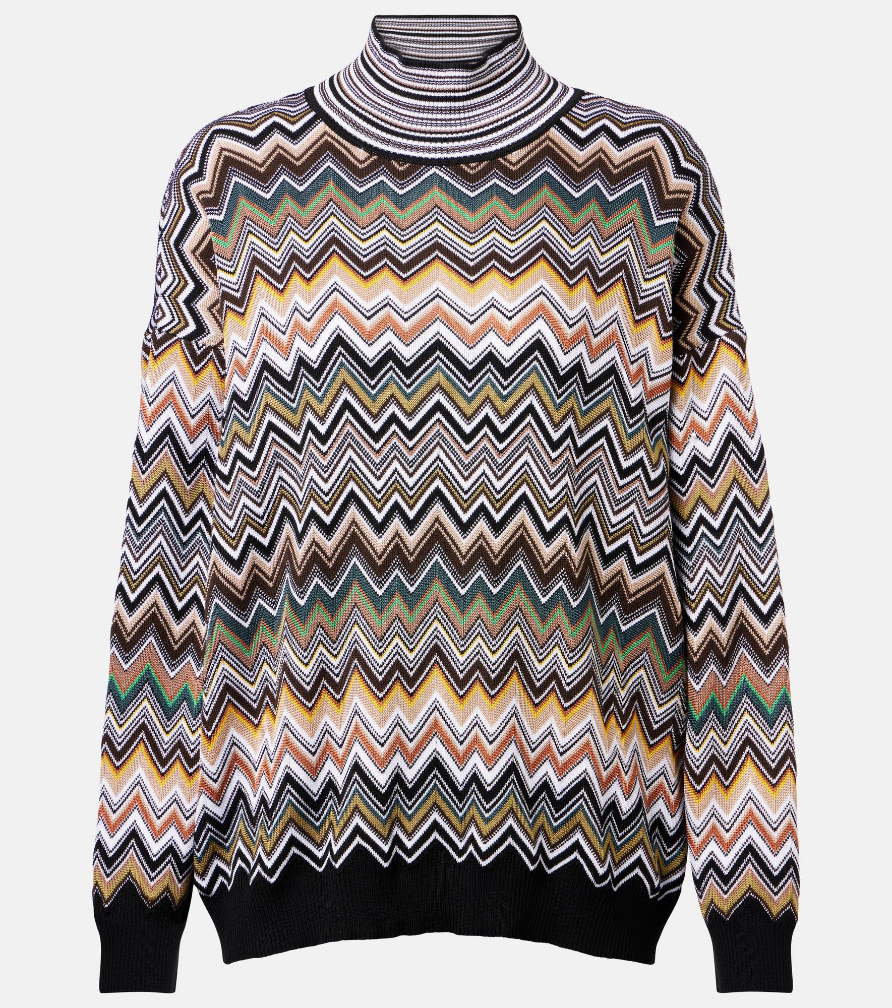 Missoni's iconic Zigzag pattern was first introduced in the 1950s and is now a symbol of Italian luxury. This sweater is adorned with the motif all over and cut to a sleek turtleneck silhouette, ideal for cooler mid-season days. Product Details - Material: 52% viscose, 35% wool, 11% polyester, 1% polyamide, 1% elastane - Care instructions: dry clean - Made in Moldova - Designer color name: Multicolor brown and yellow - Item color: multicolor - Collar: turtleneck - Oversized fit - Sleeves: long-sleeved, dropped shoulder - Hem: ribbed, straight - Cuff: ribbed - Item number: P01045600 Size & Fit - True to size - Dropped shoulders - Designed for a loose fit - Stretchy fabric - Falls below the hip - Height of model is 175cm-69" and wears a size IT 38