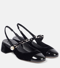 Miu Miu’s slingback pumps are designed for those who love statement-making details. Made from plush velvet, they feature patent leather toe caps and pearl-embellished chain straps. Product Details - Upper: fabric - Lining: leather - Sole: leather insole and sole - Toe shape: round toe - Made in Italy - Includes: shoe box - Designer color name: Nero - Trim: leather - Closure: elasticated strap - Hardware color: silver - Item number: P01008521 Size & Fit - True to size - Slightly wide - Half sizes please take the next size down - European sizes - 3,5cm-1.5" heel (size EU 38)