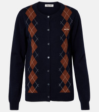 Miu Miu offers a fresh twist on the classic cardigan with this contemporary design. Crafted from soft cashmere, the design features a playful argyle pattern and is finished with subtle logo embroidery at the chest. Product Details - Material: 100% cashmere - Care instructions: dry clean - Made in Italy - Designer color name: Bleu - Item color: blue, brown - Closure: buttoned front - Contains non-textile parts of animal origin - Item number: P01069676 Size & Fit - True to size - Straight fit - Stretchy fabric - Falls to the hip - The model seen in the picture is 178cm-5'10" and wearing a size IT 40