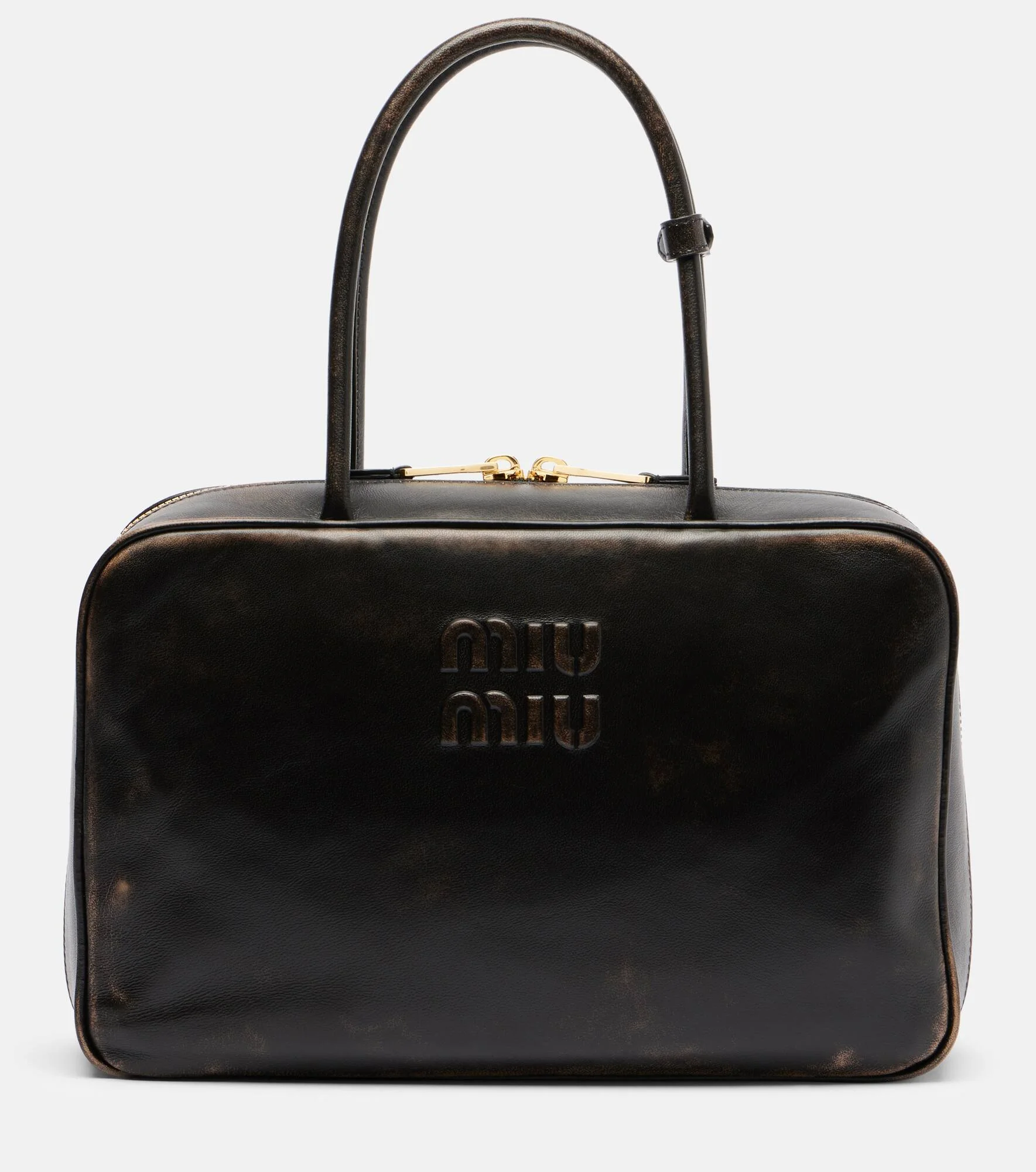 Uninhibited, carefree, and deliberately subversive: these are the hallmarks of Miuccia Prada’s Miu Miu. Crafted in Italy from leather, the Beau tote bag features embossed logo lettering, gold-toned hardware, and top handles. Product Details - Material: lamb leather - Lining: fabric - Made in Italy - Designer color name: Brown - Item color: brown - Hardware color: gold - Top handles - Closure: two-way zipped top - Internal details: single compartment, internal zipped pockets - Includes: dust bag - Item number: P01106281 Size & Fit - Height 22cm-8.5" - Width 34,5cm-13.5" - Depth 10cm-4" - Length of handles 47cm-18.5"
