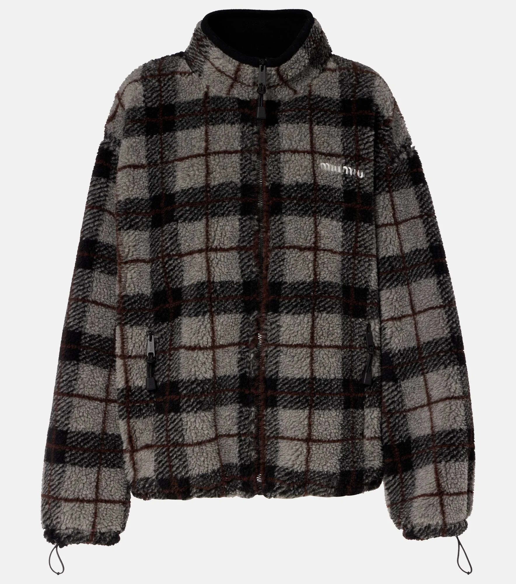 Uninhibited and deliberately subversive: these are the hallmarks of Miuccia Prada’s Miu Miu. This jacket is crafted from plush teddy fleece and boasts zipped front closure, an all-over checked pattern, and the house's embroidered logo on the chest. Product Details - Material: 70% polyester (recycled), 30% wool - Care instructions: dry clean - Made in Italy - Color: grey - Designer color name: Grigio+Nero - Item color: gray, black - Collar: mockneck - Closure: zipped front - Pockets: zipped pockets - Drawstring cuffs - Drawstring at the hem for adjustable fit - Item number: P01146947 Size & Fit - True to size - Dropped shoulders - Designed for a loose fit - Adjustable hem - Non-stretchy fabric - Falls below the hip - The model seen in the picture is 178cm-5'10" and wearing a size XS