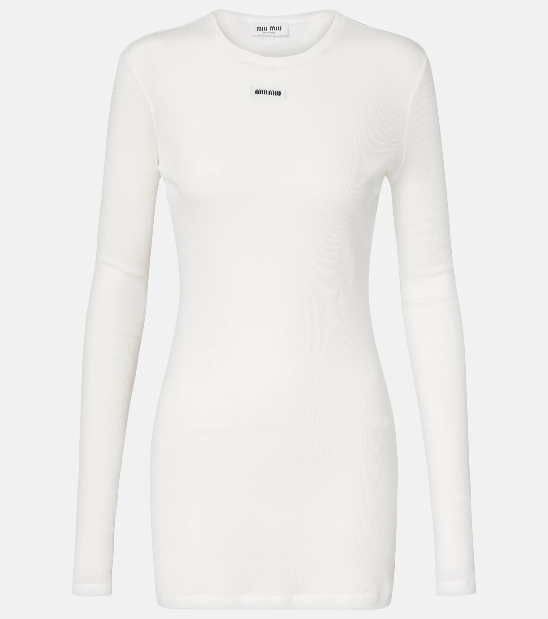 Uninhibited, carefree, and deliberately subversive: these are the hallmarks of Miuccia Prada’s Miu Miu. Crafted from soft cotton-jersey ribbed knit, this minidress features subtle branding, a crewneck, and long sleeves for an effortlessly laid-back look. Product Details - Material: 100% cotton - Care instructions: dry clean - Made in Italy - Designer color name: White - Item color: white - Collar: crewneck - Item number: P01106283 Size & Fit - True to size - Dropped shoulders - Semi-sheer - Fitted - Stretchy fabric - The model seen in the picture is 178cm-5'10" and wearing a size XS