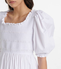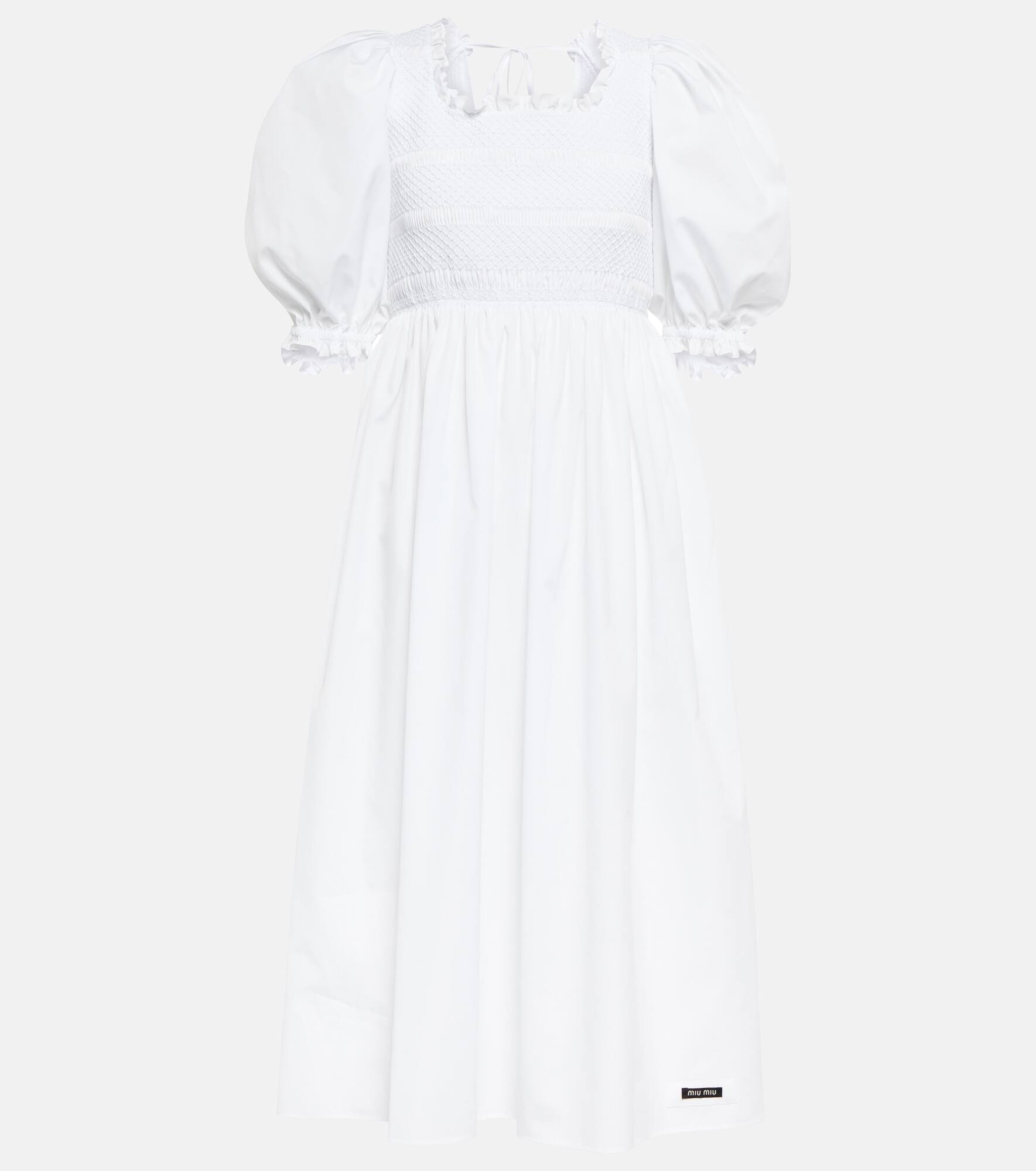From the puff sleeves to the back tie-detail, this Miu Miu cotton midi dress is a charming design from head-to-toe. It’s cut to a fit-and-flare silhouette with an embroidered, smocked bodice with ruffle trim. Product Details - Closure: self-ties, zipped back - Made in Italy - Pockets: side slit pockets - Designer color name: Bianco - Care instructions: dry clean - Elasticated sleeves - Material: 100% cotton - Item number: P00638893 Size & Fit - True to size - Low back - Cinched waist - The model seen in the picture is 178cm-5'10" and wearing a size IT 40