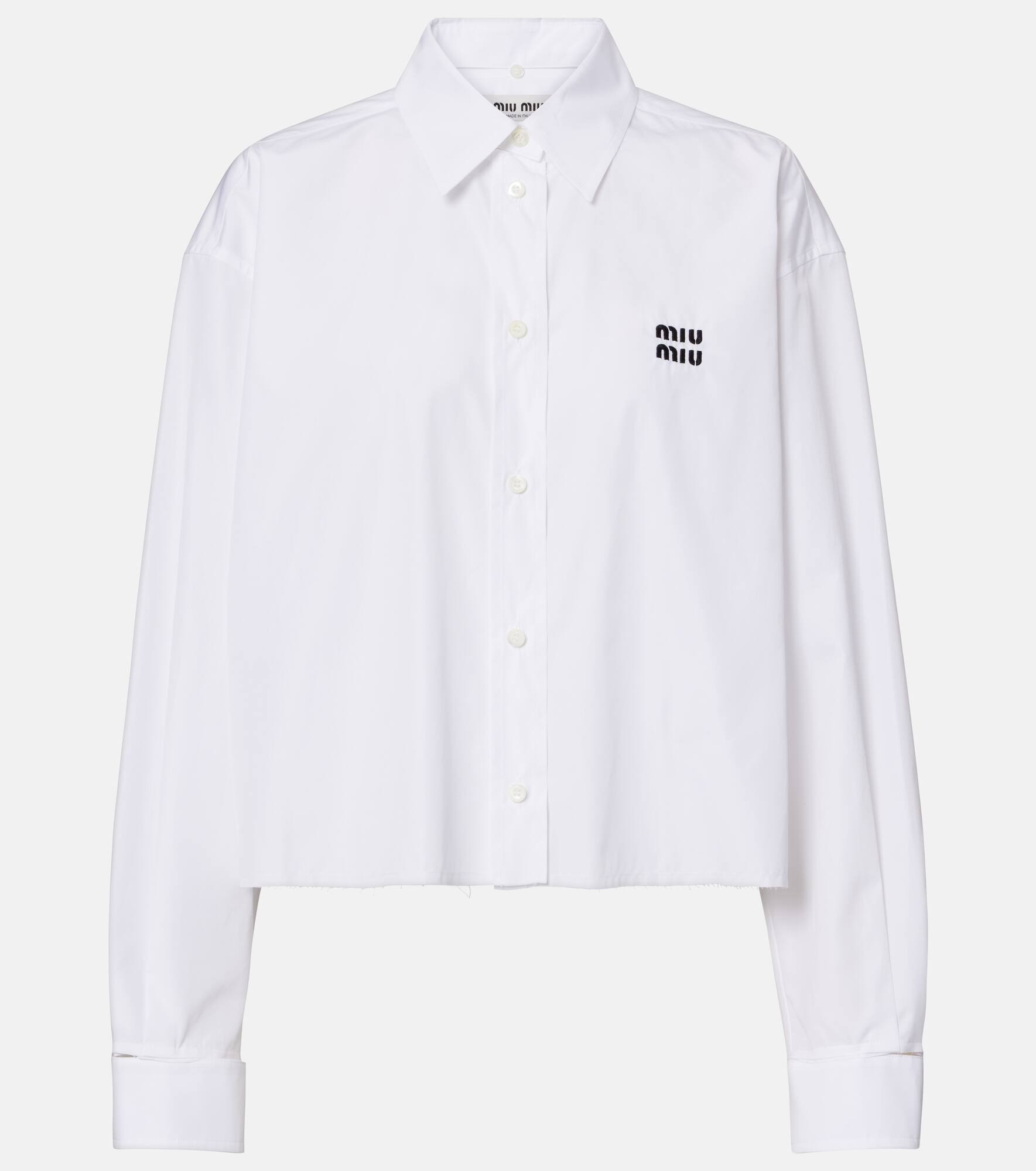 Build sophisticated ensembles around this shirt from Miu Miu. Rendered in white cotton poplin, this cropped piece is finished with the brand's logo embroidered at the chest. Product Details - Material: 100% cotton - Care instructions: dry clean - Made in Italy - Designer color name: Bianco - Item color: white - Collar: classic (Straight point) - Closure: buttoned placket - Cuff: two buttons - Hem: finished - Frayed ends - Item number: P01069689 Size & Fit - True to size - Dropped shoulders - Designed for a loose fit - Non-stretchy fabric - Falls to the hip - The model seen in the picture is 178cm-5'10" and wearing a size IT 40