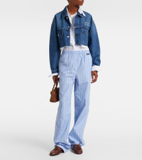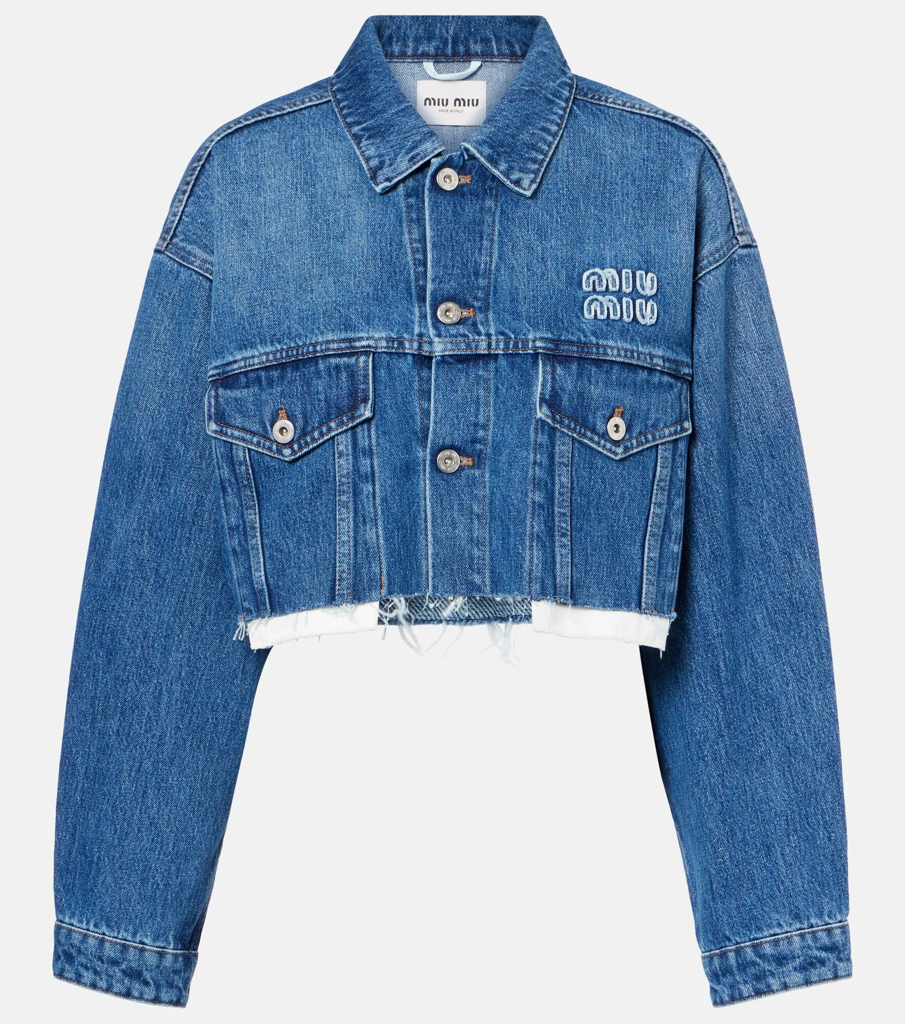 Uninhibited, carefree, and deliberately subversive: these are the hallmarks of Miuccia Prada’s Miu Miu. Crafted in Italy from pure cotton, this denim jacket features a cropped silhouette with a raw-cut hem and logo embroidery at the chest. Product Details - Material: 100% cotton - Care instructions: hand wash - Made in Italy - Designer color name: Blue - Item color: blue - Pocket lining: 100% cotton - Collar: classic (Straight point) - Pockets: flap pockets - Cuff: one button - Hem: raw - Item number: P01102286 Size & Fit - True to size - Dropped shoulders - Oversized - Non-stretchy fabric - Cropped - The model seen in the picture is 178cm-5'10" and wearing a size IT 40