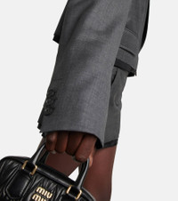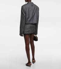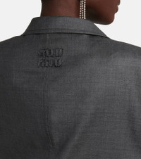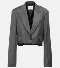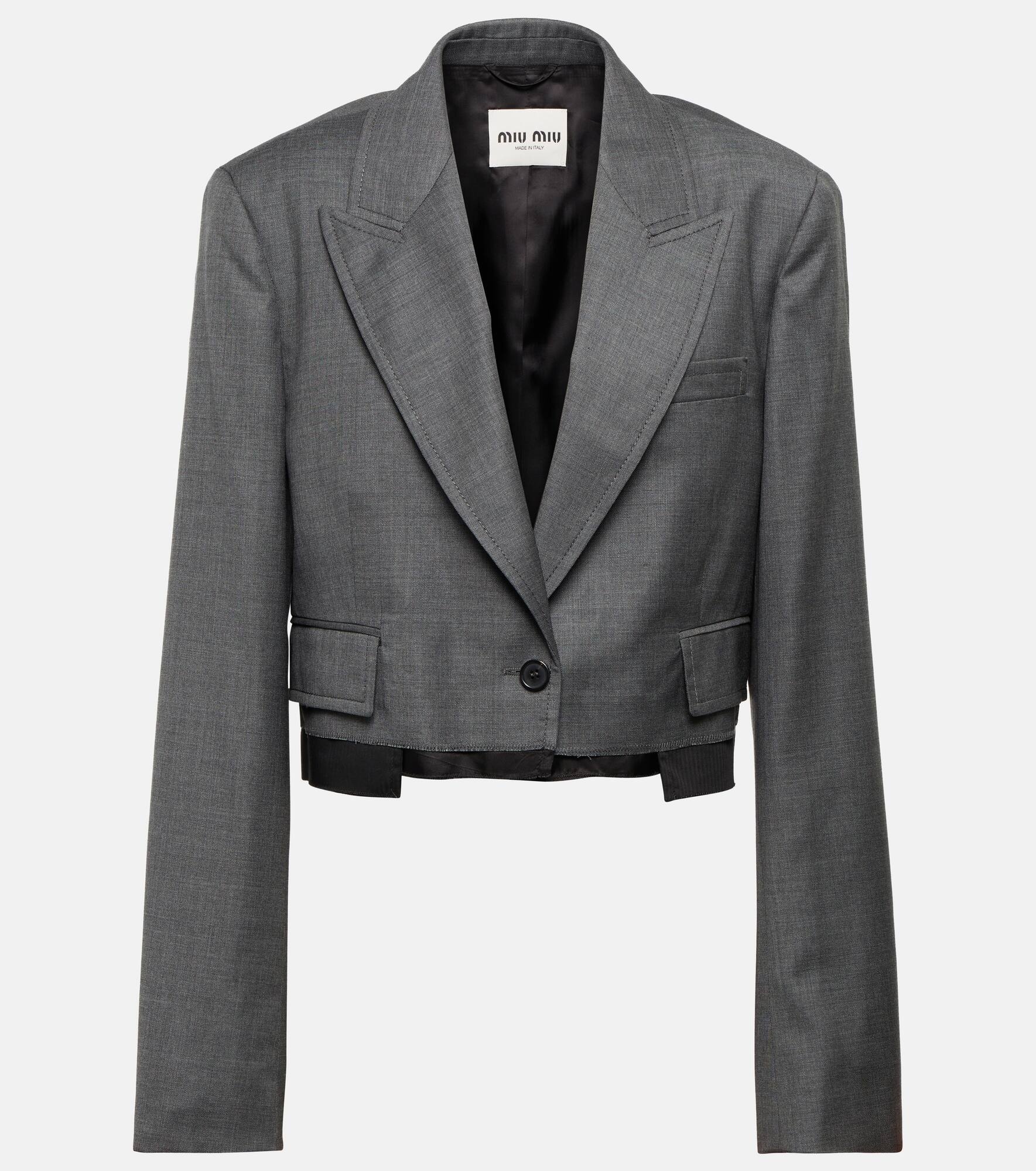 Miu Miu reimagines the classic grey blazer with this cropped design, made of virgin wool. The style has a single-breasted silhouette, peak lapels, and a raw hem. Product Details - Made in Italy - Material: 100% virgin wool - Closure: buttoned front - Designer color name: Ardesia - Care instructions: dry clean - Lining: 100% viscose - Pocket lining: 100% cotton - Item number: P00753012 Size & Fit - True to size - Extra-long sleeves - Oversized shoulders - Shoulder pad inserts - Designed for a loose fit - Slightly cropped - The model seen in the picture is 178cm-5'10" and wearing a size IT 40