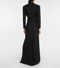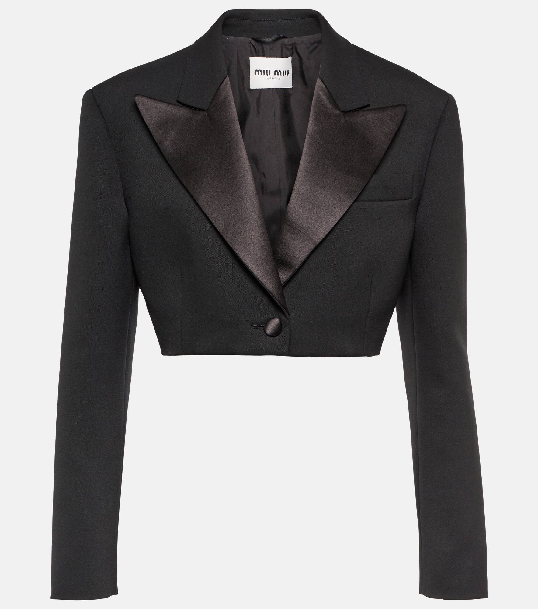 Miu Miu is known for its contemporary femininity that is at once sophisticated and charming, as shown by this single-button cropped jacket. The all-black piece juxtaposes satin tuxedo lapels with a youthful silhouette that will pair perfectly with the label's miniskirts. Product Details - Made in Italy - Lining: 70% cotton, 30% silk - Trim: 60% cupro, 40% silk - Designer color name: Nero - Pockets: faux pocket - Material: 98% virgin wool, 2% elastane - Closure: button fastening - Care instructions: dry clean - Item number: P00710194 Size & Fit - True to size - Oversized shoulders - Shoulder pad inserts - Cinched waist - Cropped - The model seen in the picture is 178cm-5'10" and wearing a size IT 40