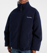 Uninhibited, carefree, and deliberately subversive: these are the hallmarks of Miuccia Prada’s Miu Miu. Crafted from warm fleece, this down-filled jacket features a plush collar, an elasticated drawstring waistband, and an embroidered logo at the chest. Product Details - Material: 90% polyester (recycled), 10% wool - Care instructions: dry clean - Made in Romania - Designer color name: Bleu - Item color: blue - Details: 64% mohair, 36% cotton - Material II: 100% polyester (recycled) - Filling: 90% down, 10% feathers - Contains non-textile parts of animal origin - Closure: zipped front - Pockets: zipped pockets - Drawstring at the hem for adjustable fit - Cuff: elasticated - Item number: P01069704 Size & Fit - True to size - Dropped shoulders - Adjustable hem - Oversized - Non-stretchy fabric - The model seen in the picture is 178cm-5'10" and wearing a size IT 40