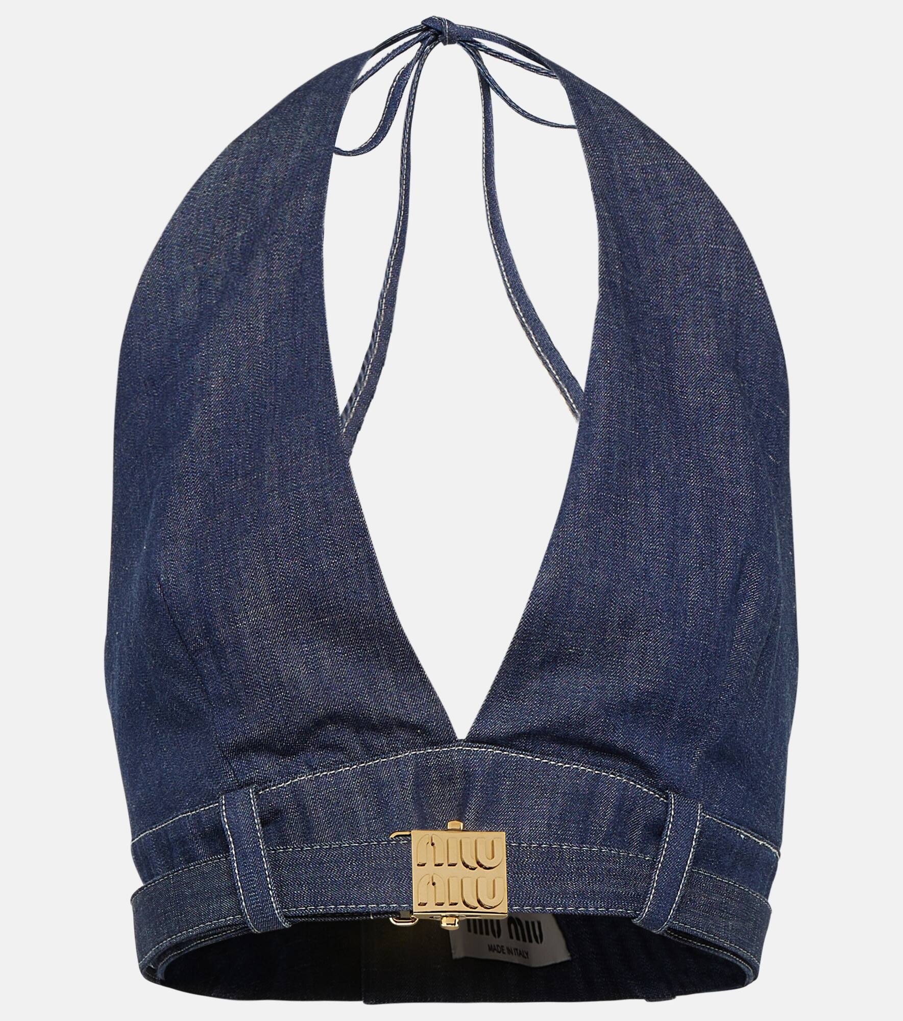 Uninhibited, carefree, and deliberately subversive: these are the hallmarks of Miuccia Prada’s Miu Miu. Spotlighting a penchant for off-kilter proportions, this blue denim halterneck bralette has a buckled detail with engraved gold-tone hardware. Product Details - Material: 100% cotton - Care instructions: dry clean - Made in Italy - Designer color name: Bleu - Lining: 100% viscose - Closure: hook fastening, self-ties - Item number: P00843969 Size & Fit - Fits large to size - we recommend trying one size smaller - Low back - Fitted - Cropped - The model seen in the picture is 178cm-5'10" and wearing a size IT 38