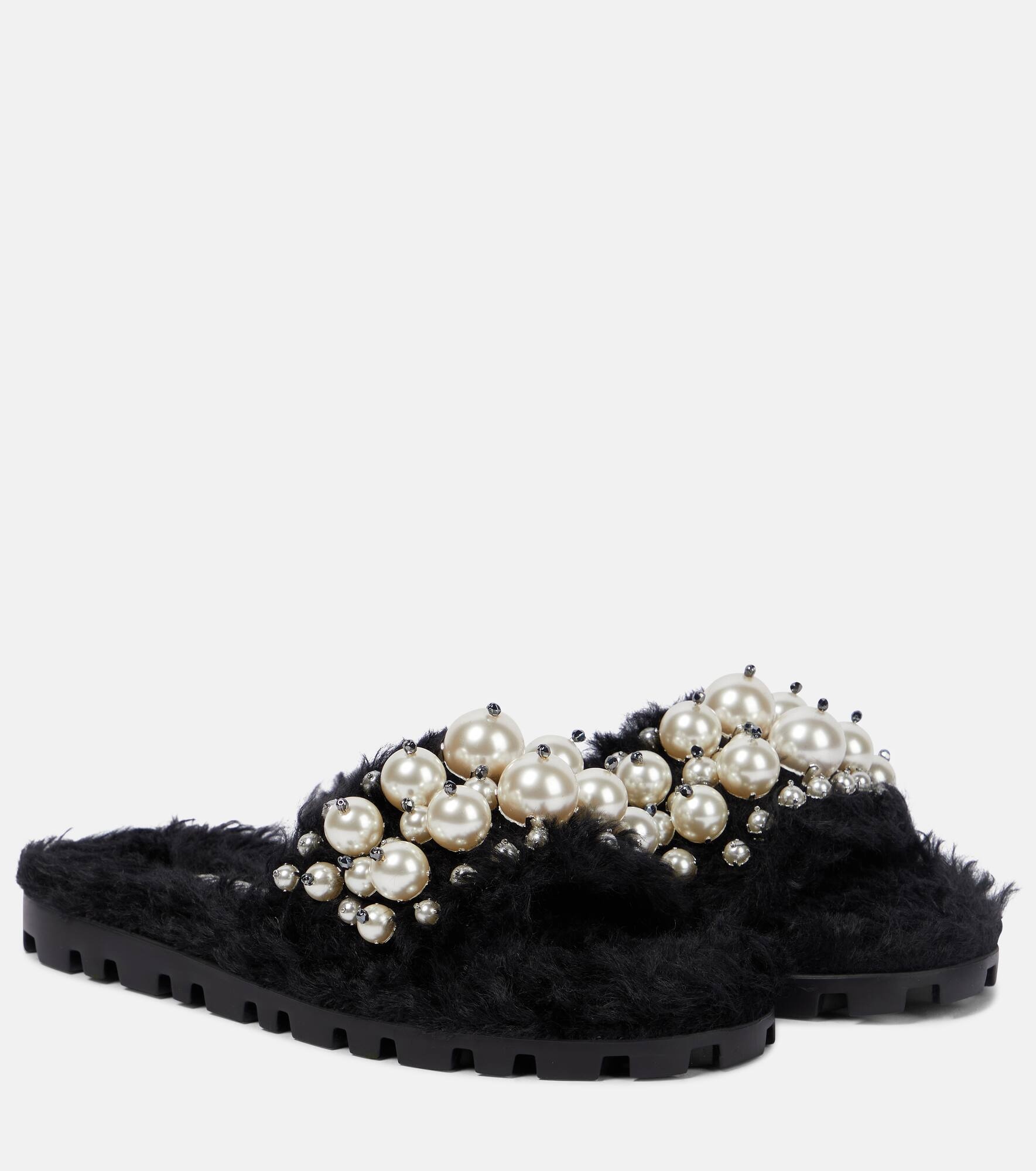 Add glamour to your daily looks with these faux shearling slides from Miu Miu. Their straps are embellished with faux pearls for a playful touch. Product Details - Toe shape: round open toe - Lining: leather, fabric - Upper: fabric - Sole: fabric insole, rubber sole - Made in Italy - Designer color name: Nero - Item number: P00616435 Size & Fit - Fits large to size - we recommend trying one size smaller - European sizes - 3cm-1" platform (size EU 38)