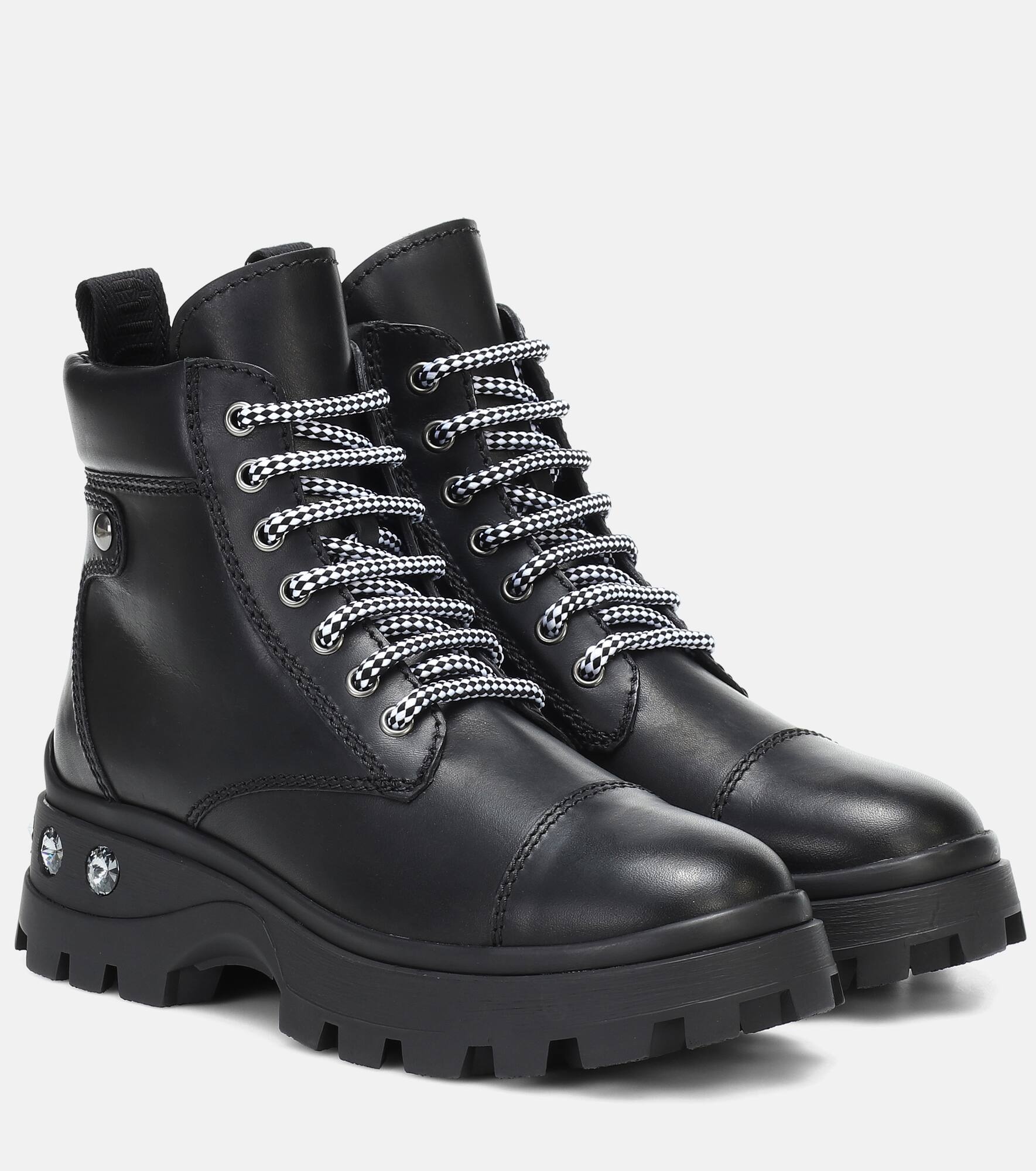 Miu Miu, the master of whimsy, takes a tough-luxe ankle boot silhouette and infuses it with signature girlish charm this season. Crafted in Italy from smooth black leather, the design adjusts with gingham laces and features sparking crystals embedded into its rubber sole. Pair yours with the brand's tiered dresses for contrast. Product Details - Lining: leather - Sole: leather insole, rubber sole - Toe shape: round toe - Upper: calf leather - Closure: lace-up - Designer color name: Nero - Made in Italy - Item number: P00404144 Size & Fit - True to size - Slightly wide - European sizes - 3cm-1" platform (size EU 38) - 5cm-2" wedge heel (size EU 38)