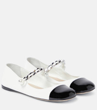 Miu Miu combines ballet flats with Mary Jane design codes to form this elegant black and white pair. They're made from calfskin leather with glossy patent toecaps, silver-toned chain accents across the straps, and low-stacked heels for all-day comfort. Product Details - Lining: leather - Upper: calf leather - Sole: leather insole and sole - Toe shape: square toe - Made in Italy - Designer color name: Bianco+Nero - Item number: P00616406 Size & Fit - Fits slightly large to size - we recommend trying a half size smaller - Stiff material - European sizes
