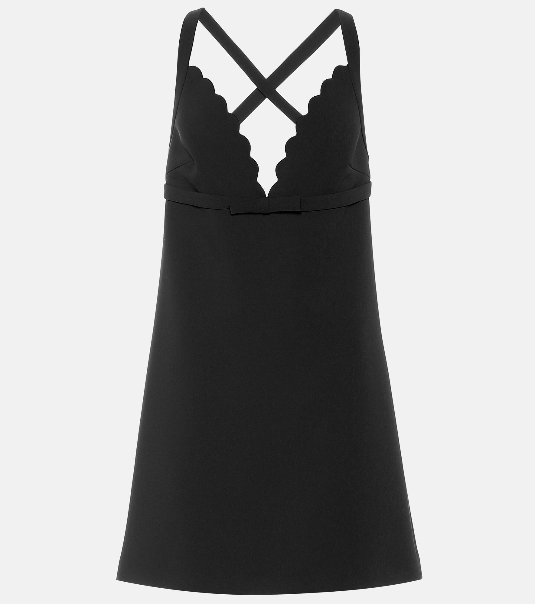Miu Miu's signature scallops adorn the neckline of this LBD, the perfect piece for evening events. Crafted in Italy from black faille cady, the minidress has a dainty bow detail at the bust, crossover straps at the back, and an A-line silhouette. Wear yours to an invite-only dinner with a matelasse clutch from the label in hand. Product Details - Lining: 100% polyester, fully lined - Made in Italy - Closure: zipped back - Designer color name: Nero - Care instructions: dry clean - Material: 71% triacetate, 29% polyester - Item number: P00405930 Size & Fit - True to size - Low back - Cinched waist - The model seen in the picture is 178cm-5'10" and wearing a size IT 40