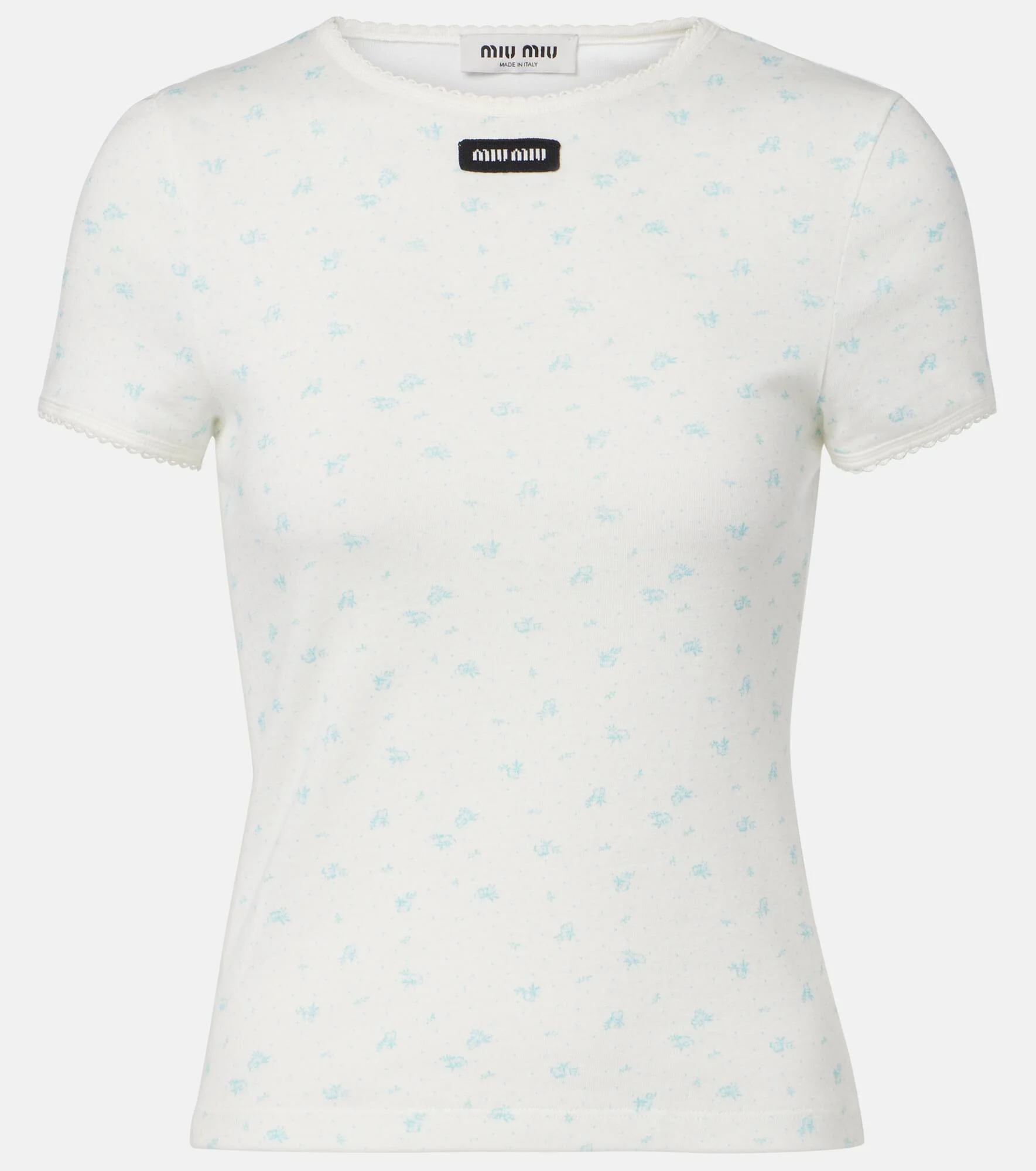 Uninhibited and deliberately subversive: these are the hallmarks of Miuccia Prada’s Miu Miu. This fitted silhouette is made from cotton jersey and has a faint, demure floral print. Product Details - Material: 100% cotton - Care instructions: machine wash cold - Made in Italy - Color: white - Designer color name: Bianco+Azzurro - Item color: white, blue - Item number: P01146943 Size & Fit - True to size - Fitted - Stretchy fabric - Falls to the hip - The model seen in the picture is 178cm-5'10" and wearing a size XS